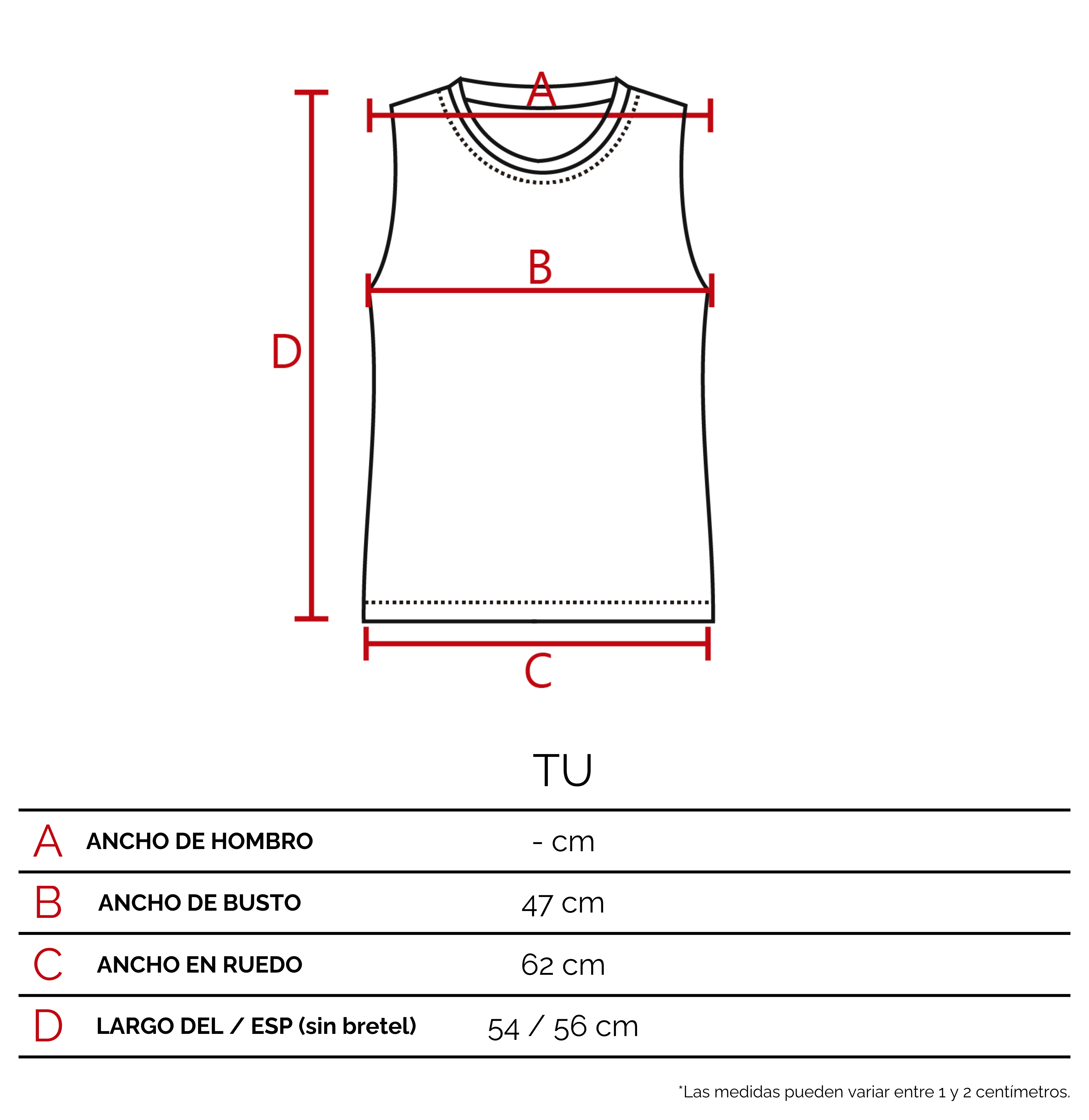 Te recomendamos que agarres una prenda tuya, de características similares a éste producto. Extendela sobre una superficie plana, y con un centímetro tomá las medidas sobre los puntos como lo indicamos en el dibujo. De esta manera vas a poder tener una referencia del tamaño de la prenda.
