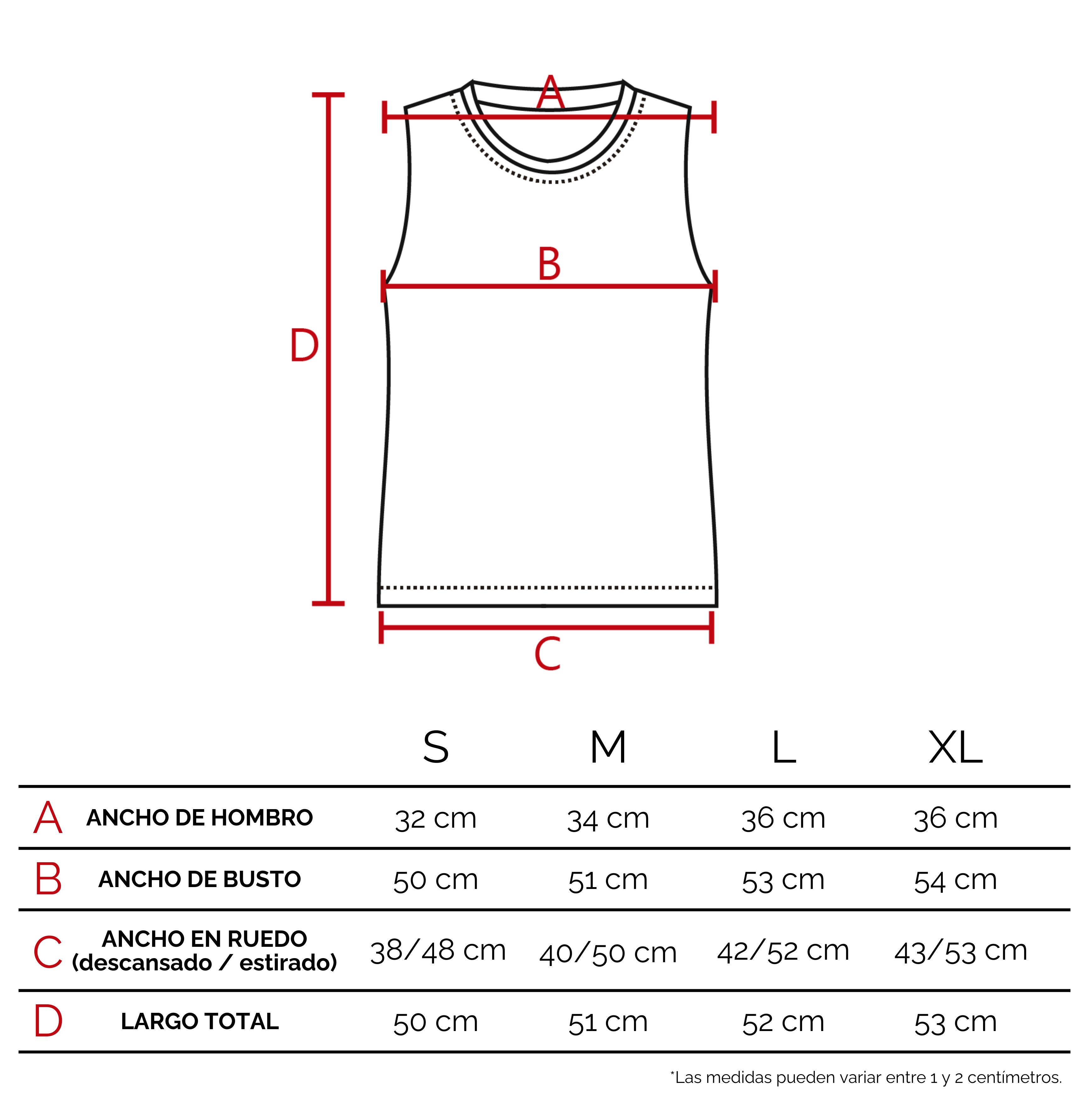 Te recomendamos que agarres una prenda tuya, de características similares a éste producto. Extendela sobre una superficie plana, y con un centímetro tomá las medidas sobre los puntos como lo indicamos en el dibujo. De esta manera vas a poder tener una referencia del tamaño de la prenda.