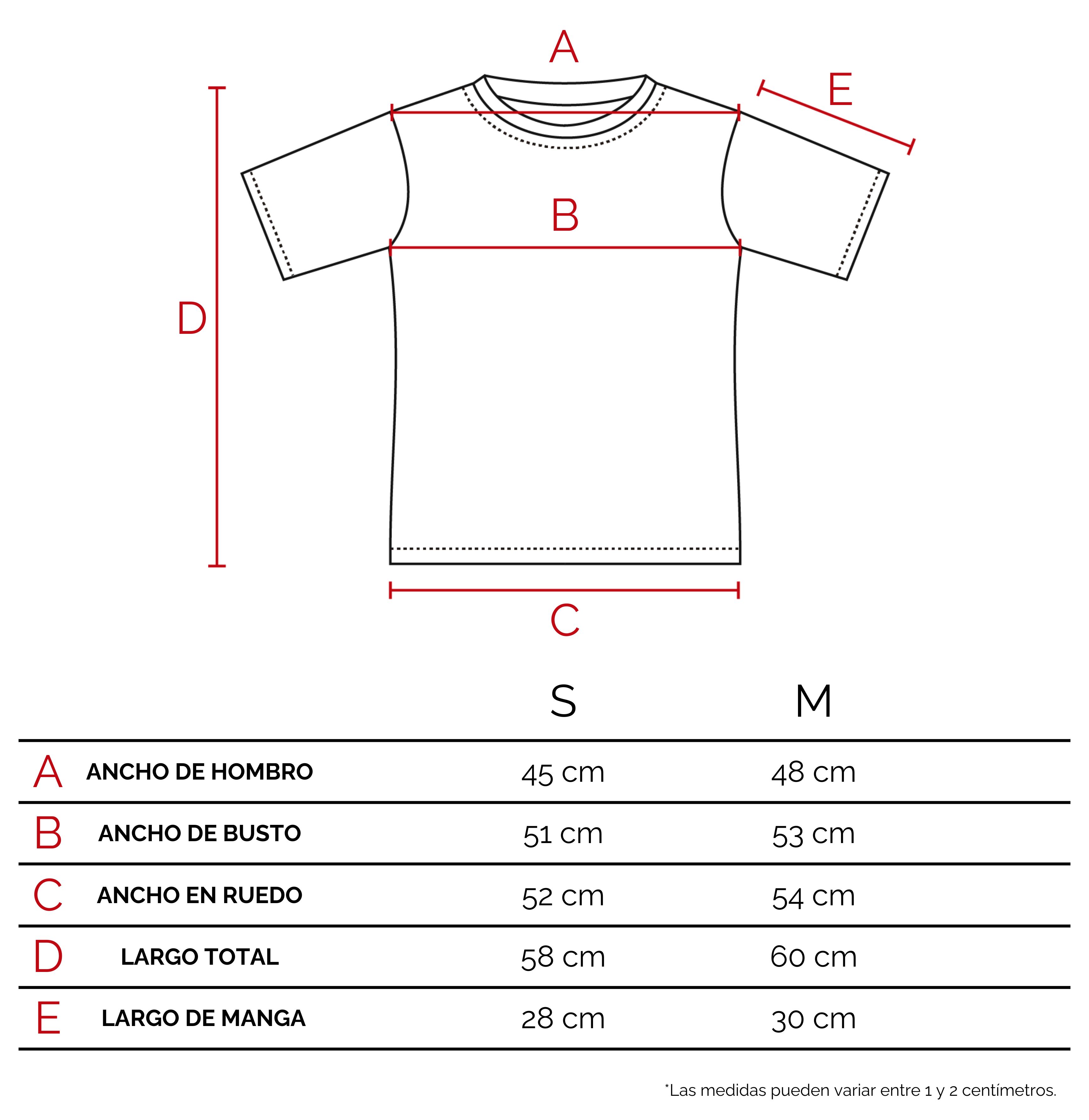 Te recomendamos que agarres una prenda tuya, de características similares a éste producto. Extendela sobre una superficie plana, y con un centímetro tomá las medidas sobre los puntos como lo indicamos en el dibujo. De esta manera vas a poder tener una referencia del tamaño de la prenda.
