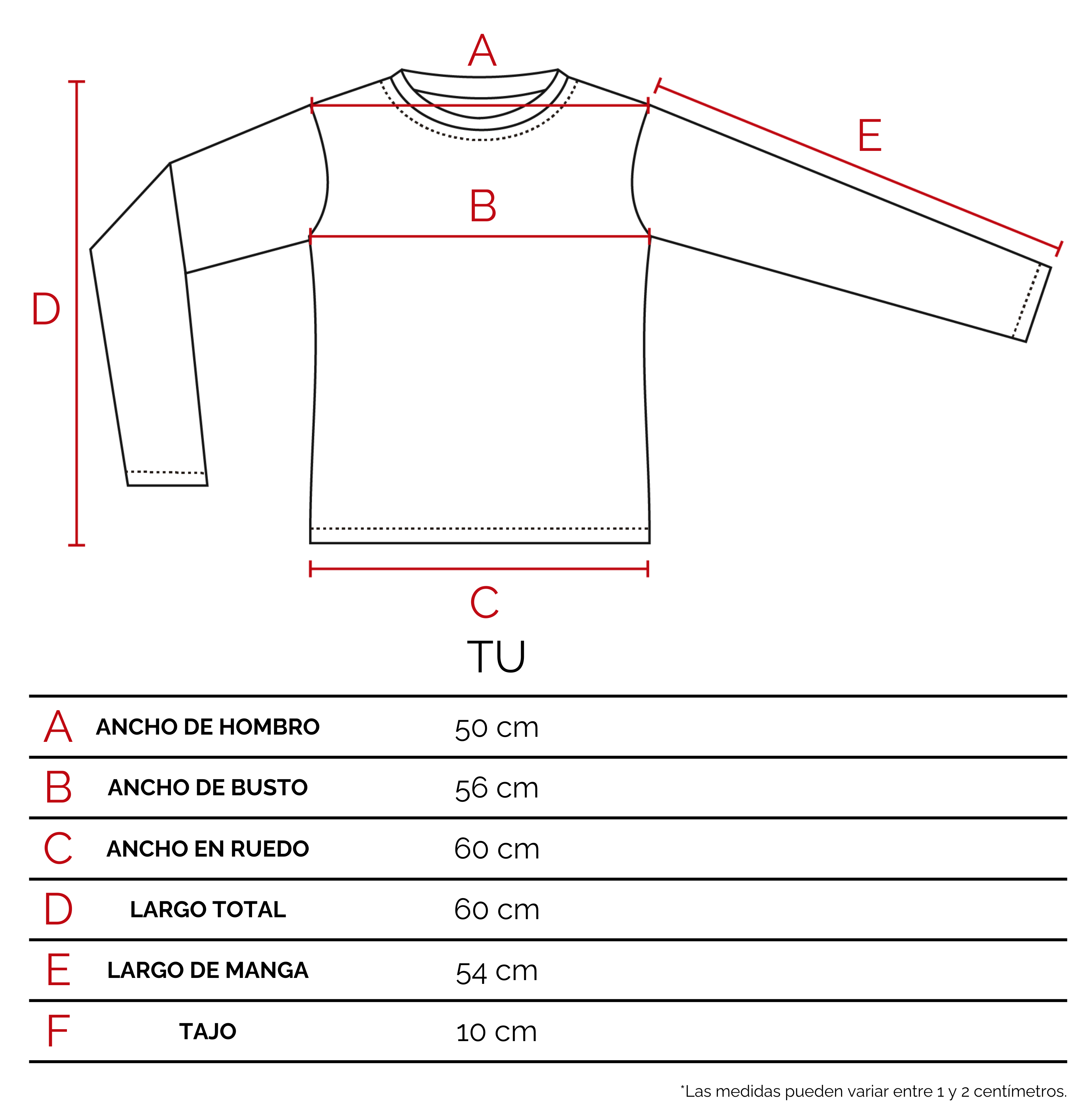 Te recomendamos que agarres una prenda tuya, de características similares a éste producto. Extendela sobre una superficie plana, y con un centímetro tomá las medidas sobre los puntos como lo indicamos en el dibujo. De esta manera vas a poder tener una referencia del tamaño de la prenda.