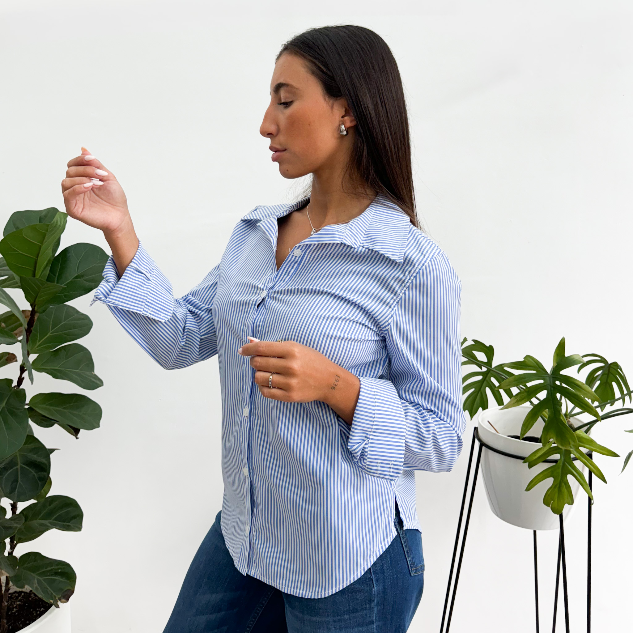 ??La CAMISA EMBER es una camisa A RAYAS divina! Es de corte básico con pinzas de busto que ayudan a definir la silueta. Tiene una terminación en ruedo circular y el plus de la tela, a rayas trendy celeste y blanco.