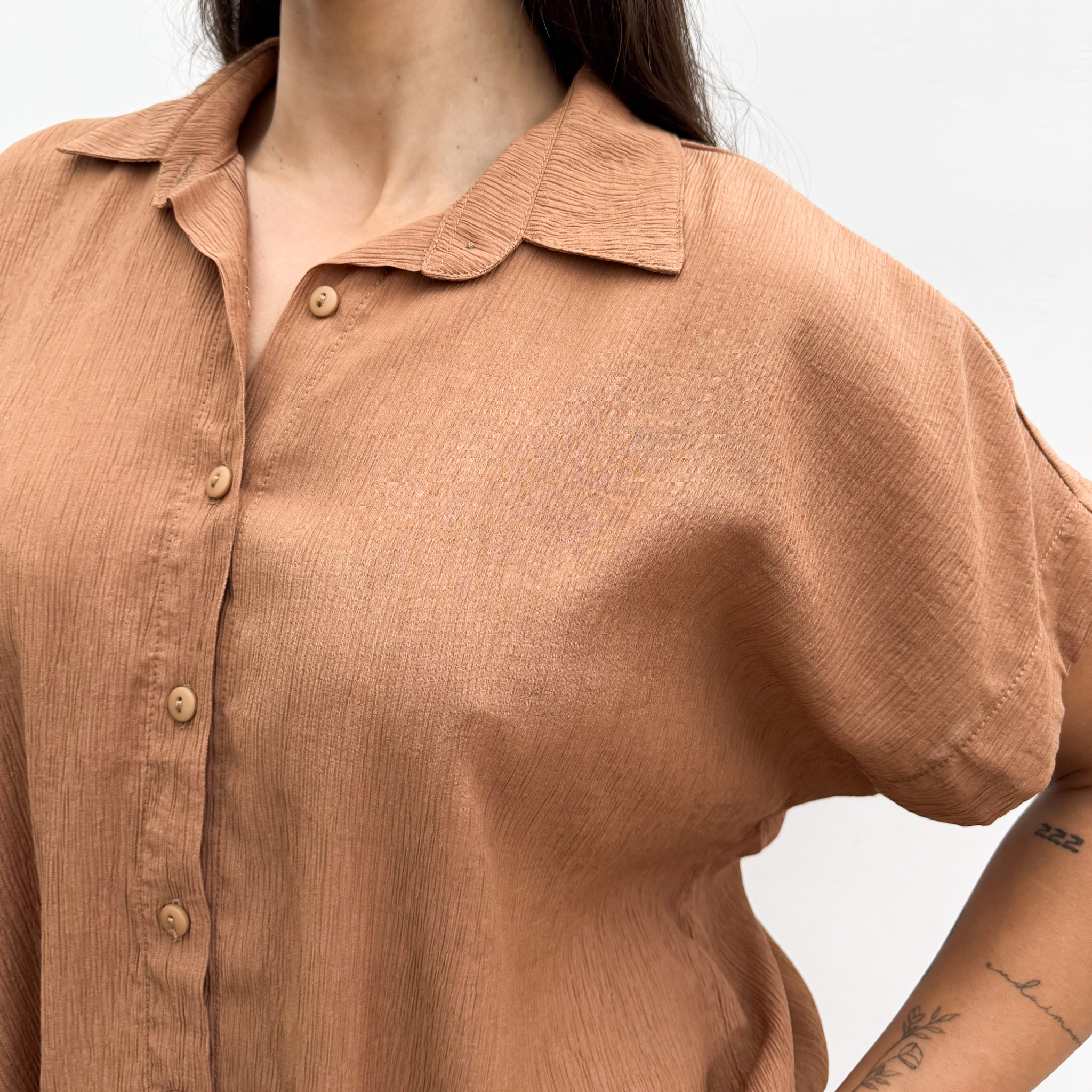 La CAMISA NILO es una camisa preciosa, hecha en bambula mezcla, un material con textura arrugada y liviana, súper suave y con una caída divina. Tiene hombro caído y no tiene mangas, y la espalda es un poco más larga que el delantero. Es una prenda que eleva cualquier look y, además, si se la combina con el pantalón Nilo, se puede lograr un look monocromático espectacular!