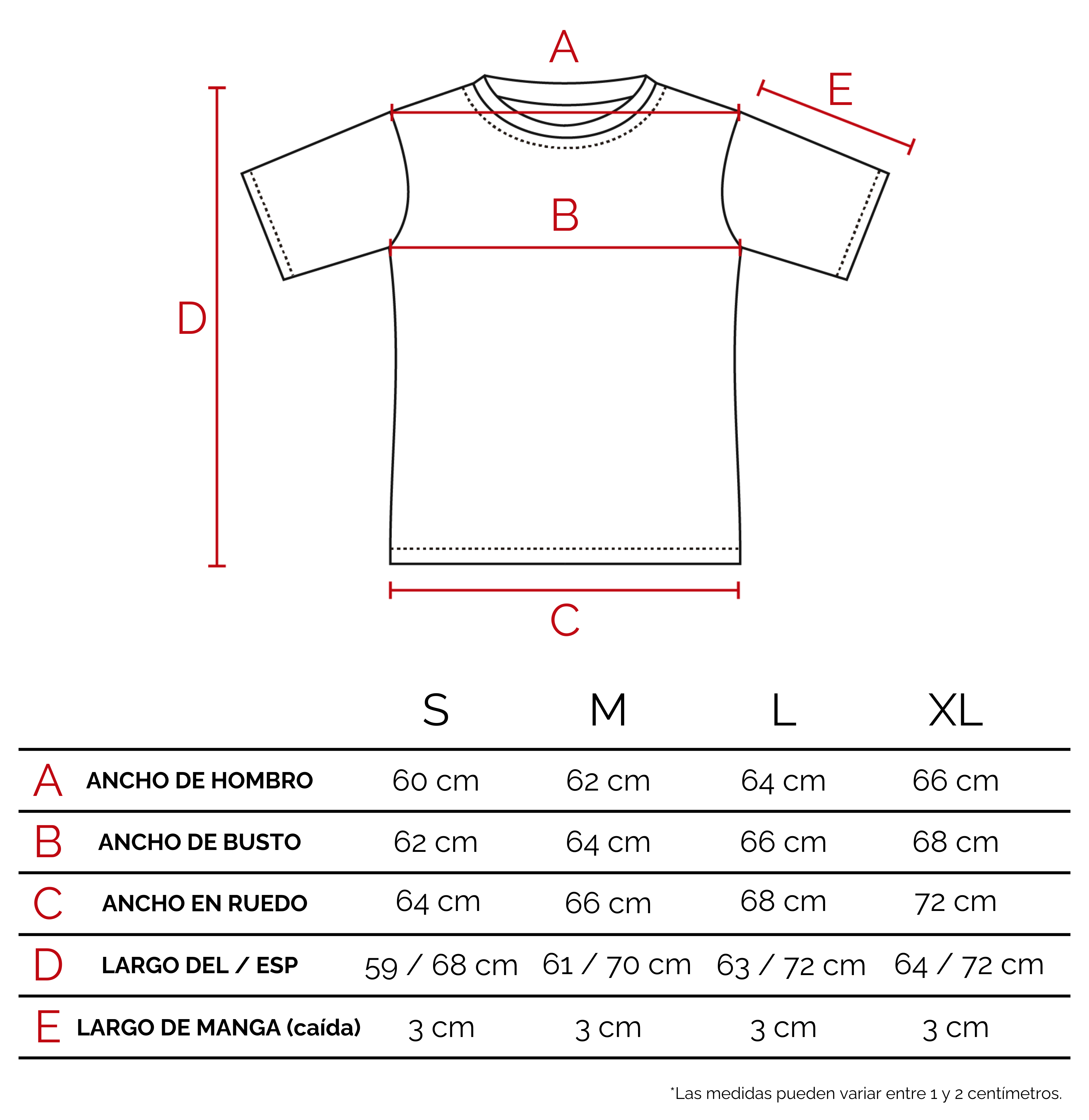 Te recomendamos que agarres una prenda tuya, de características similares a éste producto. Extendela sobre una superficie plana, y con un centímetro tomá las medidas sobre los puntos como lo indicamos en el dibujo. De esta manera vas a poder tener una referencia del tamaño de la prenda.
