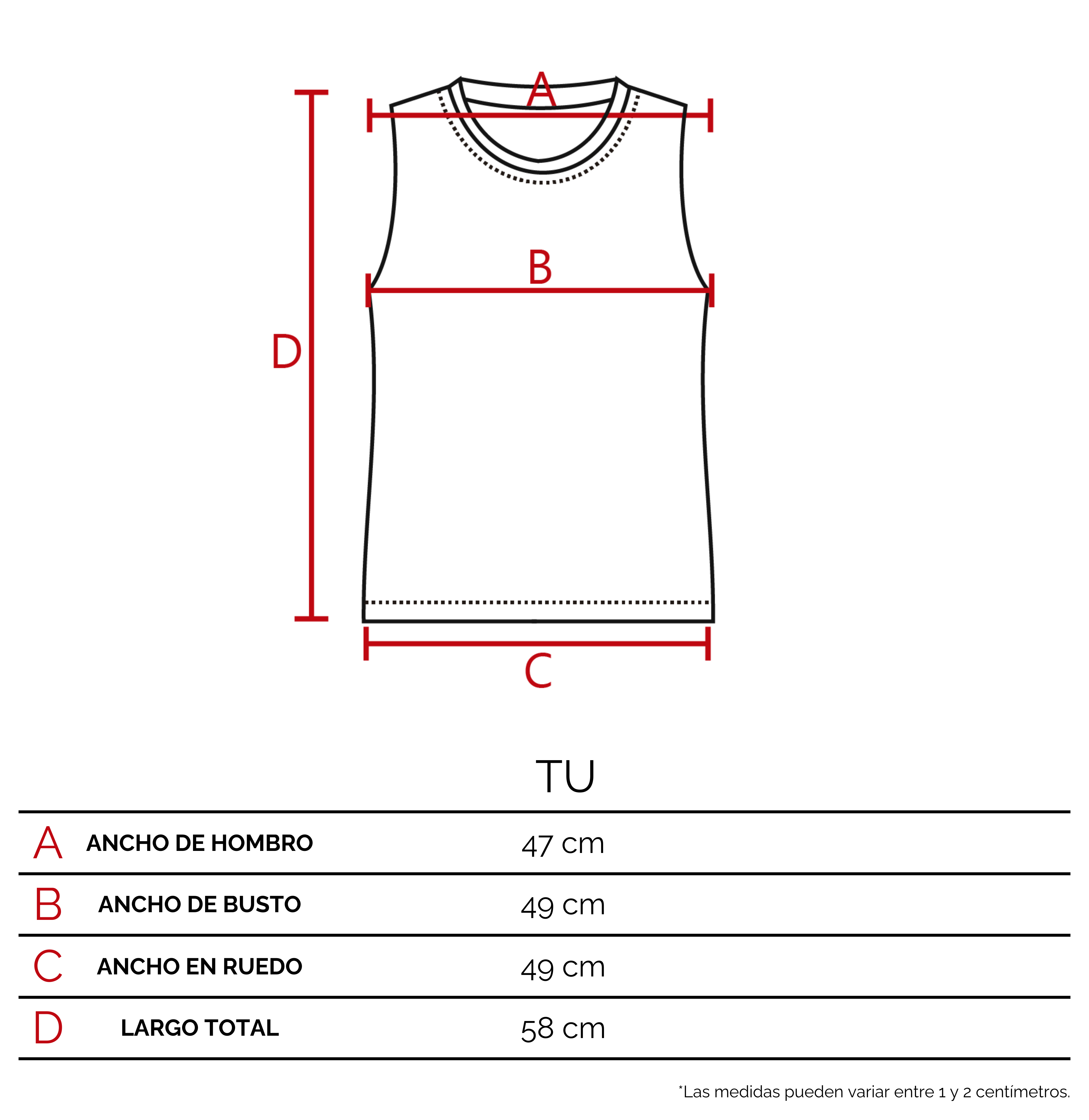 Te recomendamos que agarres una prenda tuya, de características similares a éste producto. Extendela sobre una superficie plana, y con un centímetro tomá las medidas sobre los puntos como lo indicamos en el dibujo. De esta manera vas a poder tener una referencia del tamaño de la prenda.
