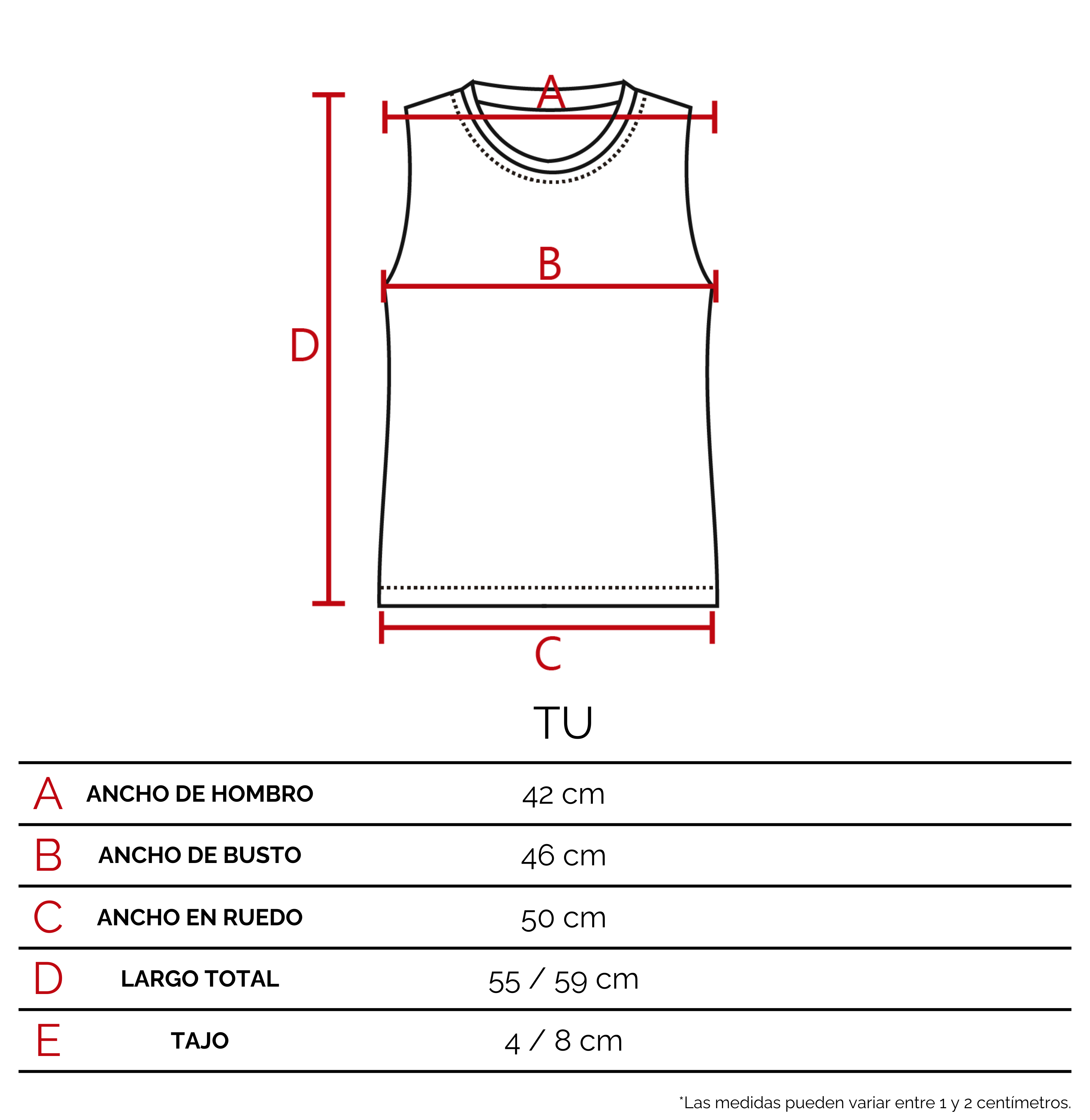 Te recomendamos que agarres una prenda tuya, de características similares a éste producto. Extendela sobre una superficie plana, y con un centímetro tomá las medidas sobre los puntos como lo indicamos en el dibujo. De esta manera vas a poder tener una referencia del tamaño de la prenda.
