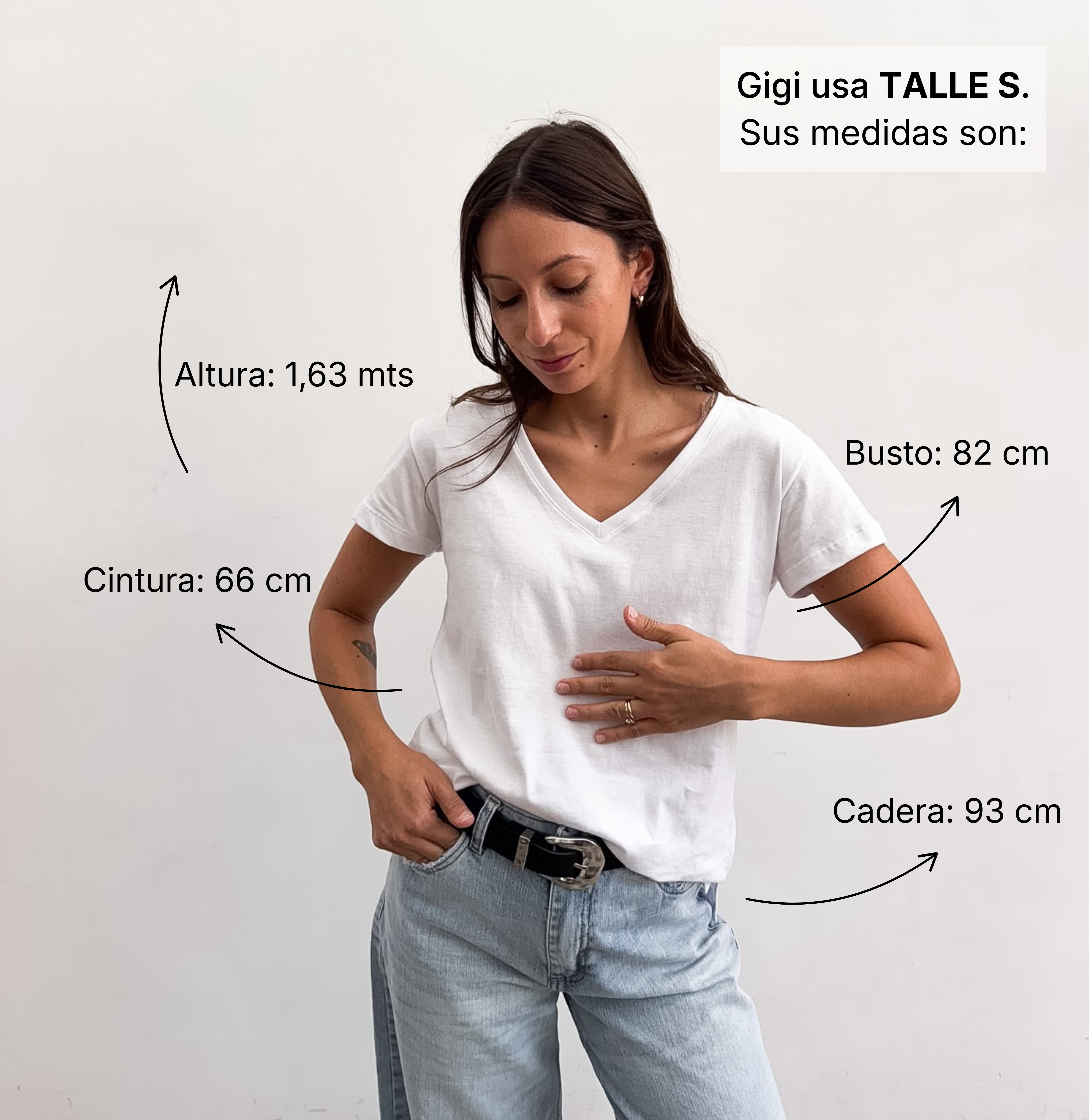 Te recomendamos que agarres una prenda tuya, de características similares a éste producto. Extendela sobre una superficie plana, y con un centímetro tomá las medidas sobre los puntos como lo indicamos en el dibujo. De esta manera vas a poder tener una referencia del tamaño de la prenda.