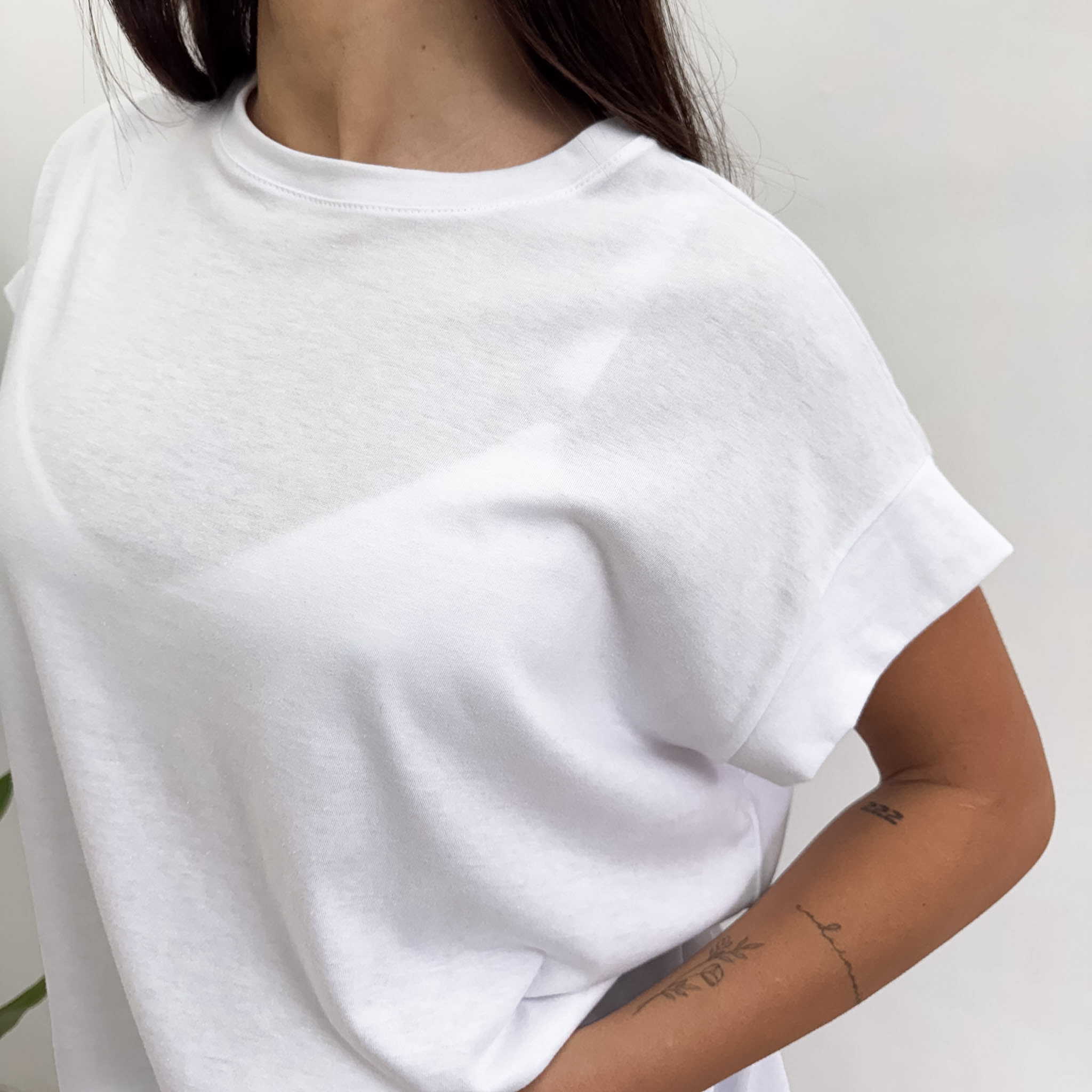 La REMERA ILARIA ALGODÓN es una remera de escote redondo cerrado, con hombro caído y sin mangas, con recortes para dar terminación. Está hecha en un jersey de algodón pesado, que le da más estructura al modelo. Es una remera básica con detalles que la hacen única, ideal para agregar a tu colección de básicos!