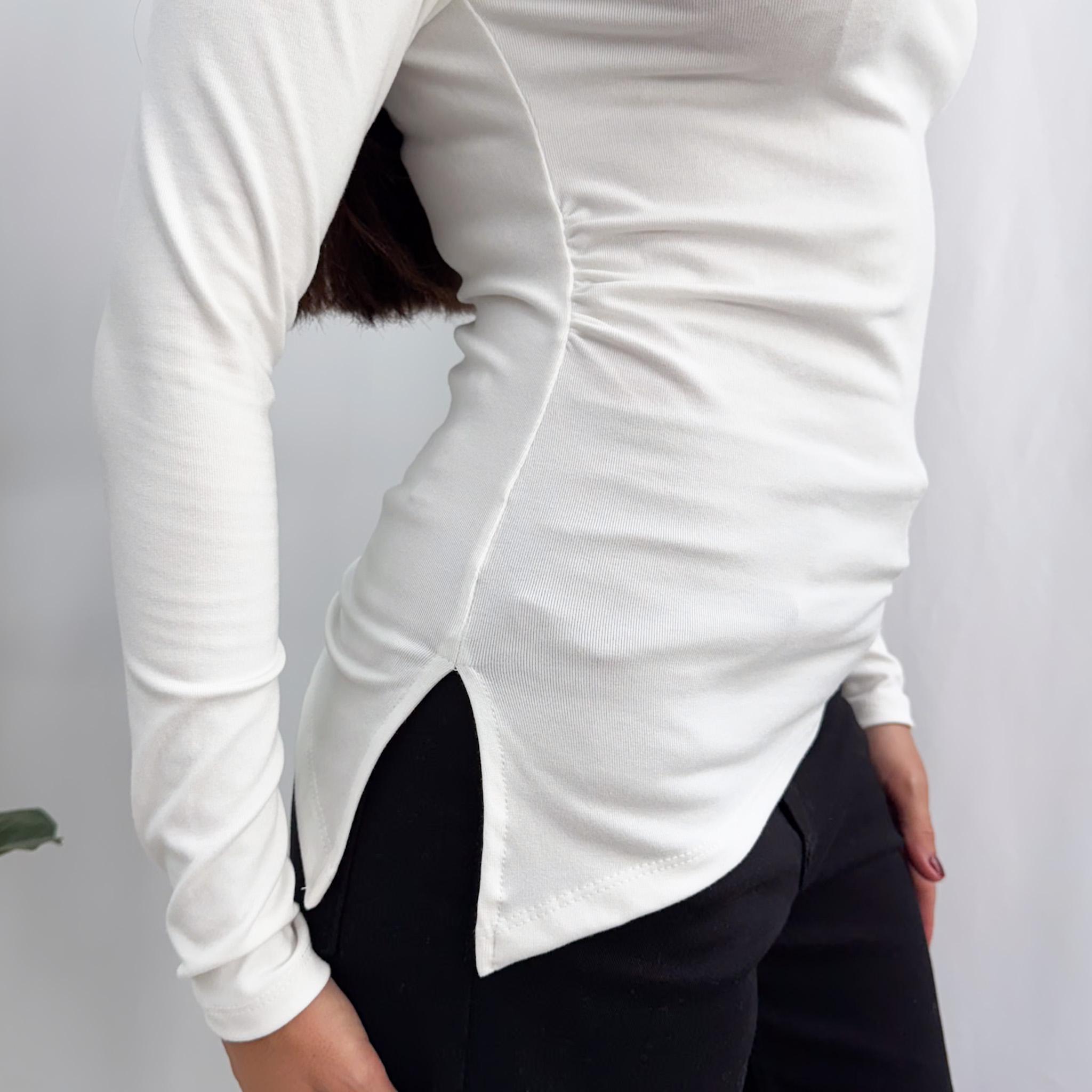 La REMERA IVANNA es una remera manga larga DI-VI-NA! Es básica con detalles que la hacen única! Tiene cuello cerrado tipo bote, frunces en los costados y un tajo en uno de los laterales. Además tiene una terminación irregular que la hace súper canchera! Está hecha en jersey viscosa, un material súper suave y cómodo que se adapta bien al cuerpo y permite libertad de movimiento! Es perfecta para usar como protagonista del look o debajo de otras capas!