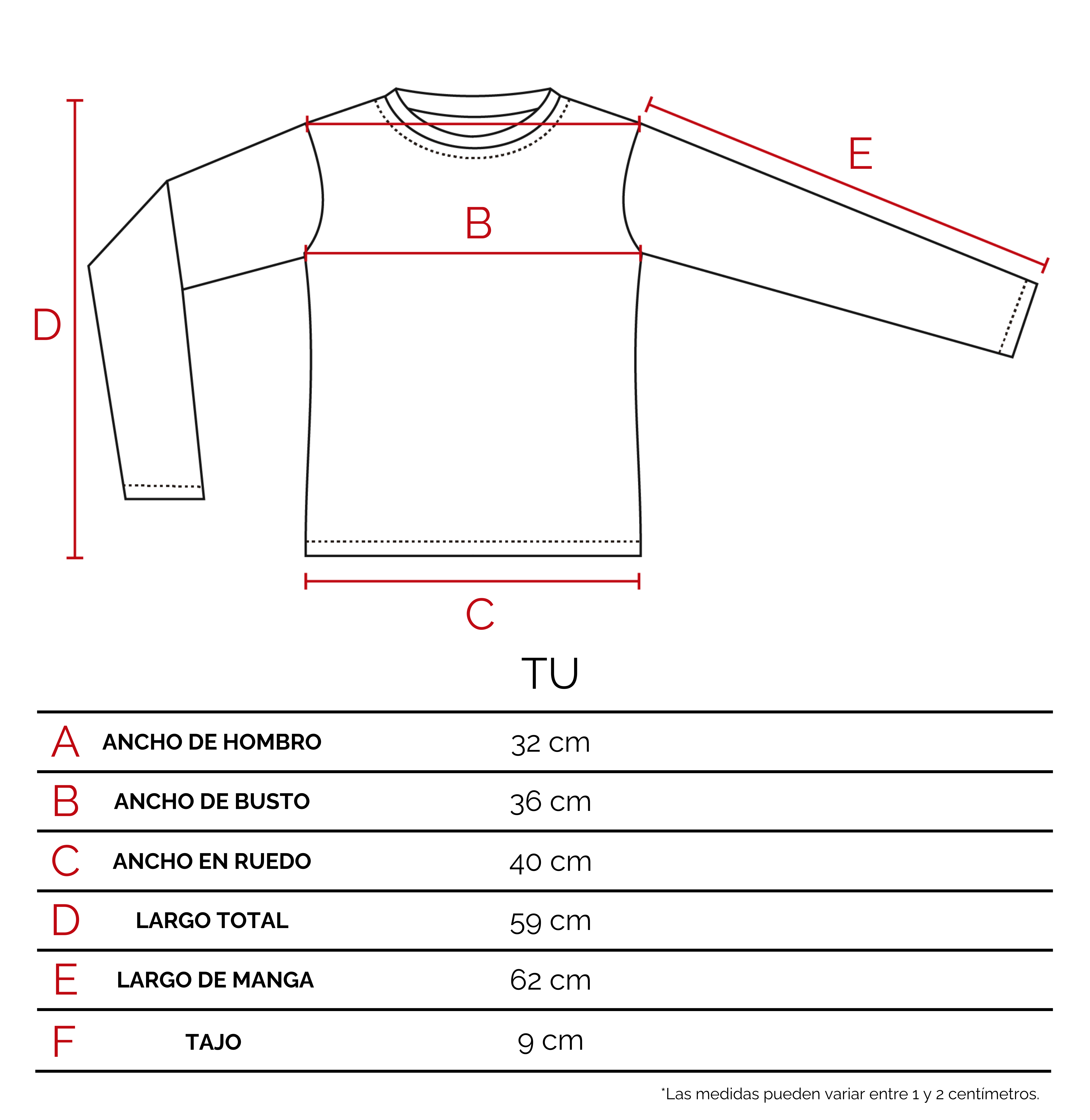 Te recomendamos que agarres una prenda tuya, de características similares a éste producto. Extendela sobre una superficie plana, y con un centímetro tomá las medidas sobre los puntos como lo indicamos en el dibujo. De esta manera vas a poder tener una referencia del tamaño de la prenda.