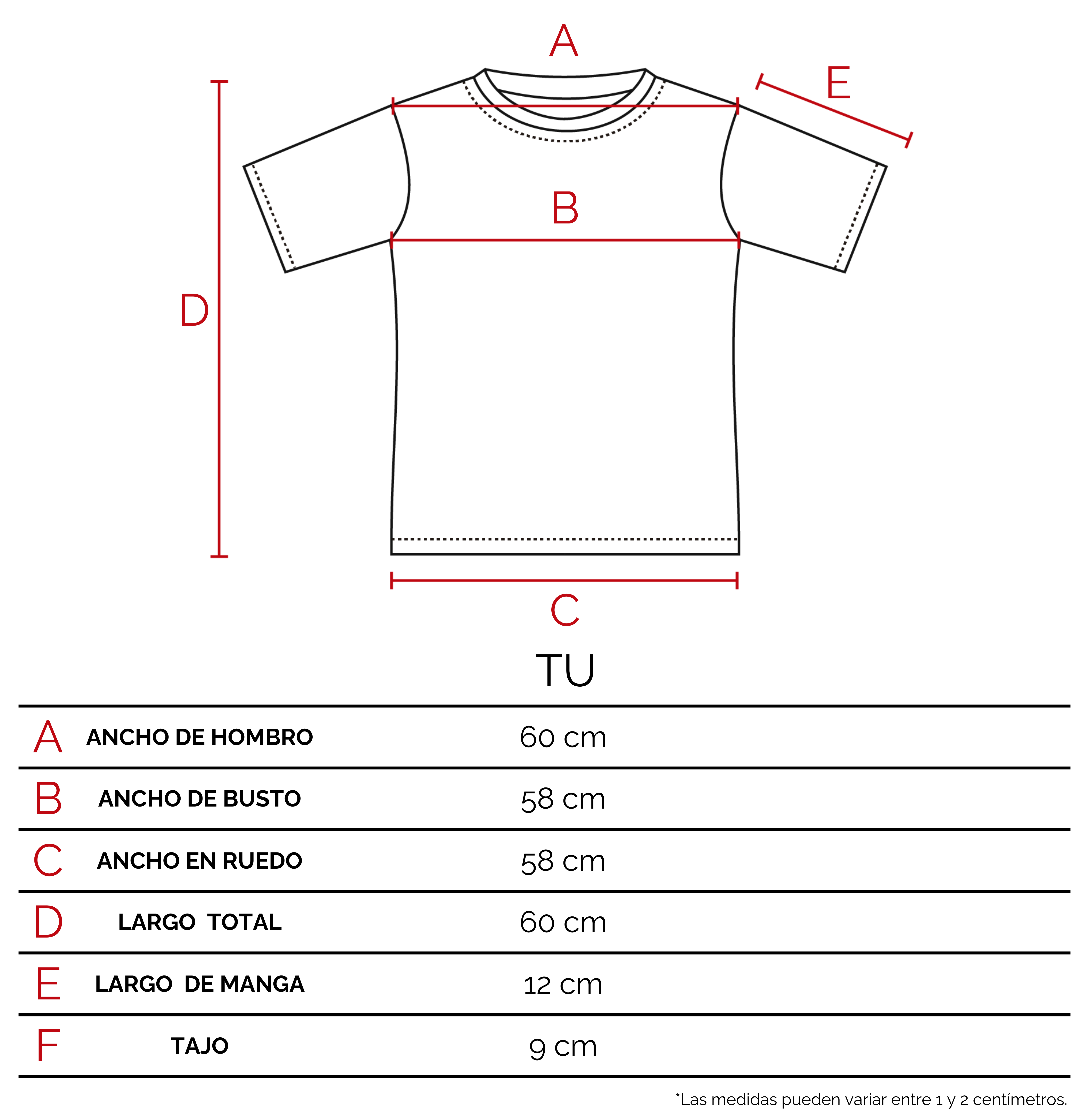 Te recomendamos que agarres una prenda tuya, de características similares a éste producto. Extendela sobre una superficie plana, y con un centímetro tomá las medidas sobre los puntos como lo indicamos en el dibujo. De esta manera vas a poder tener una referencia del tamaño de la prenda.