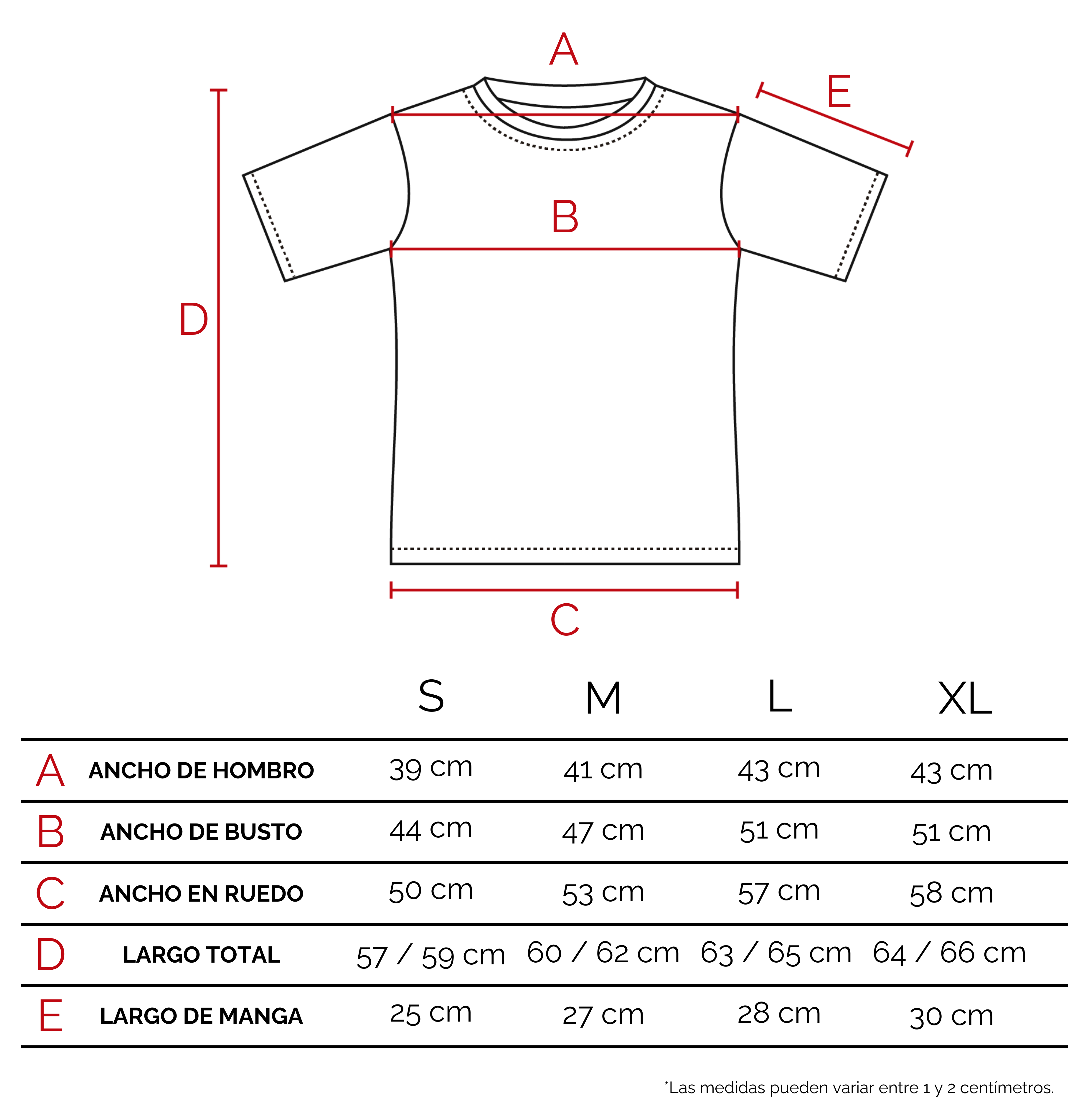 Te recomendamos que agarres una prenda tuya, de características similares a éste producto. Extendela sobre una superficie plana, y con un centímetro tomá las medidas sobre los puntos como lo indicamos en el dibujo. De esta manera vas a poder tener una referencia del tamaño de la prenda.