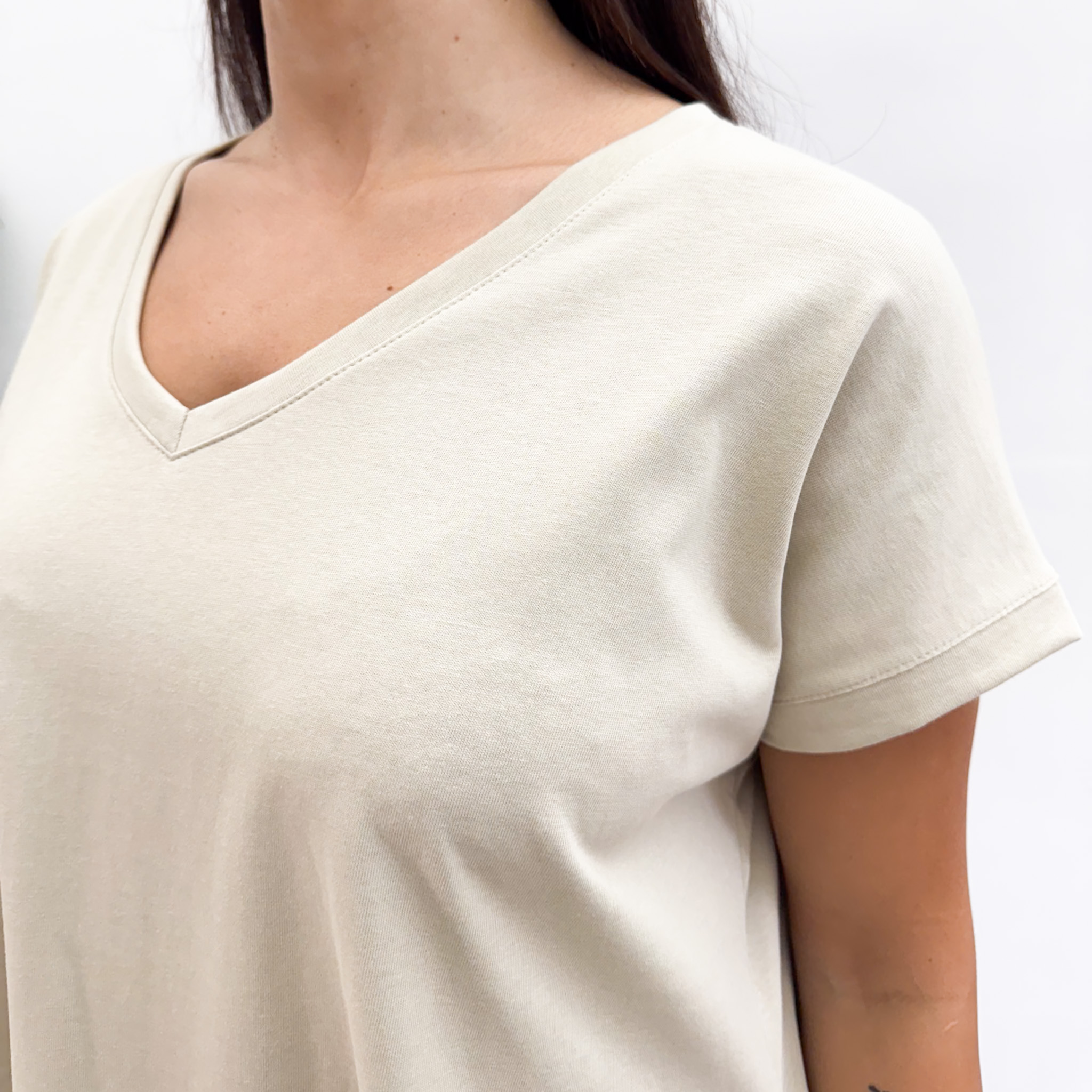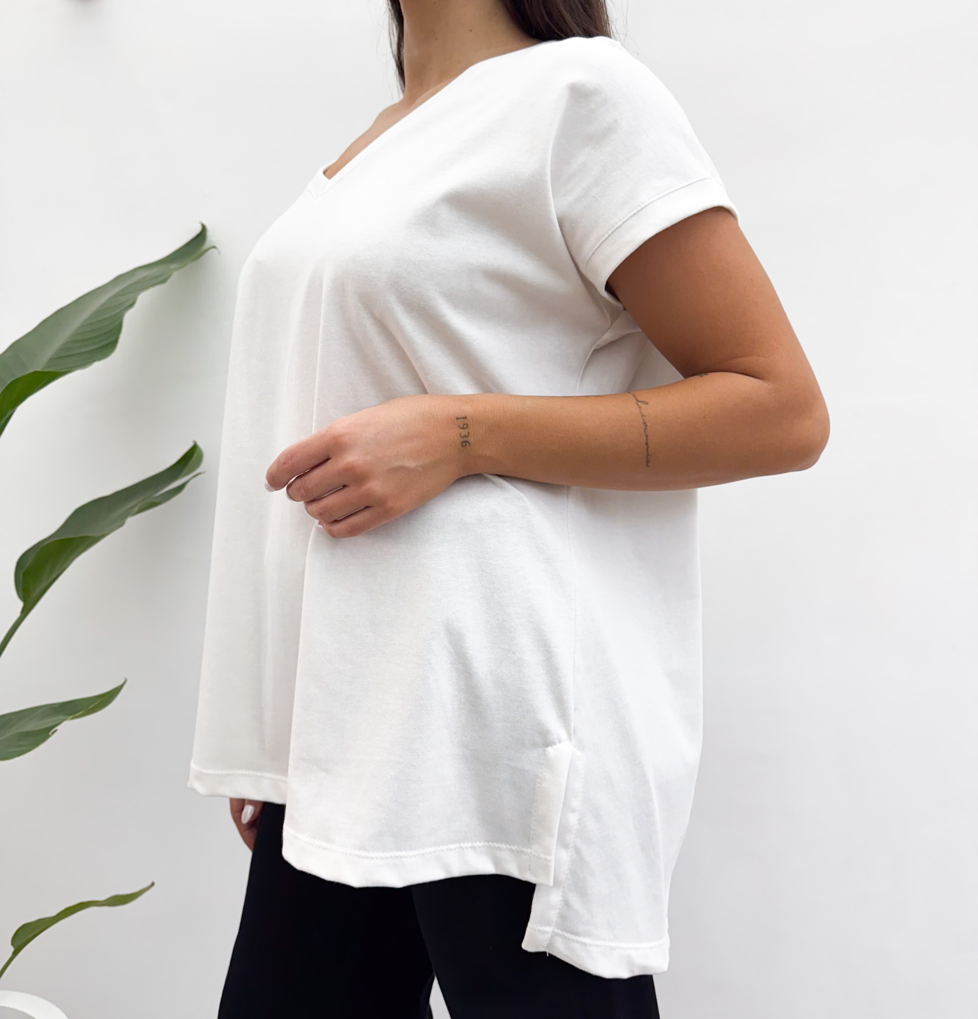 La REMERA OFELIA ESCOTE V es una remera básica, hecha en jersey de algodón, sin manga con hombro caído. Tiene tajos en los costados y la espalda es un poco más larga que el delantero. Súper versátil y atemporal para usar en cualquier ocasión!