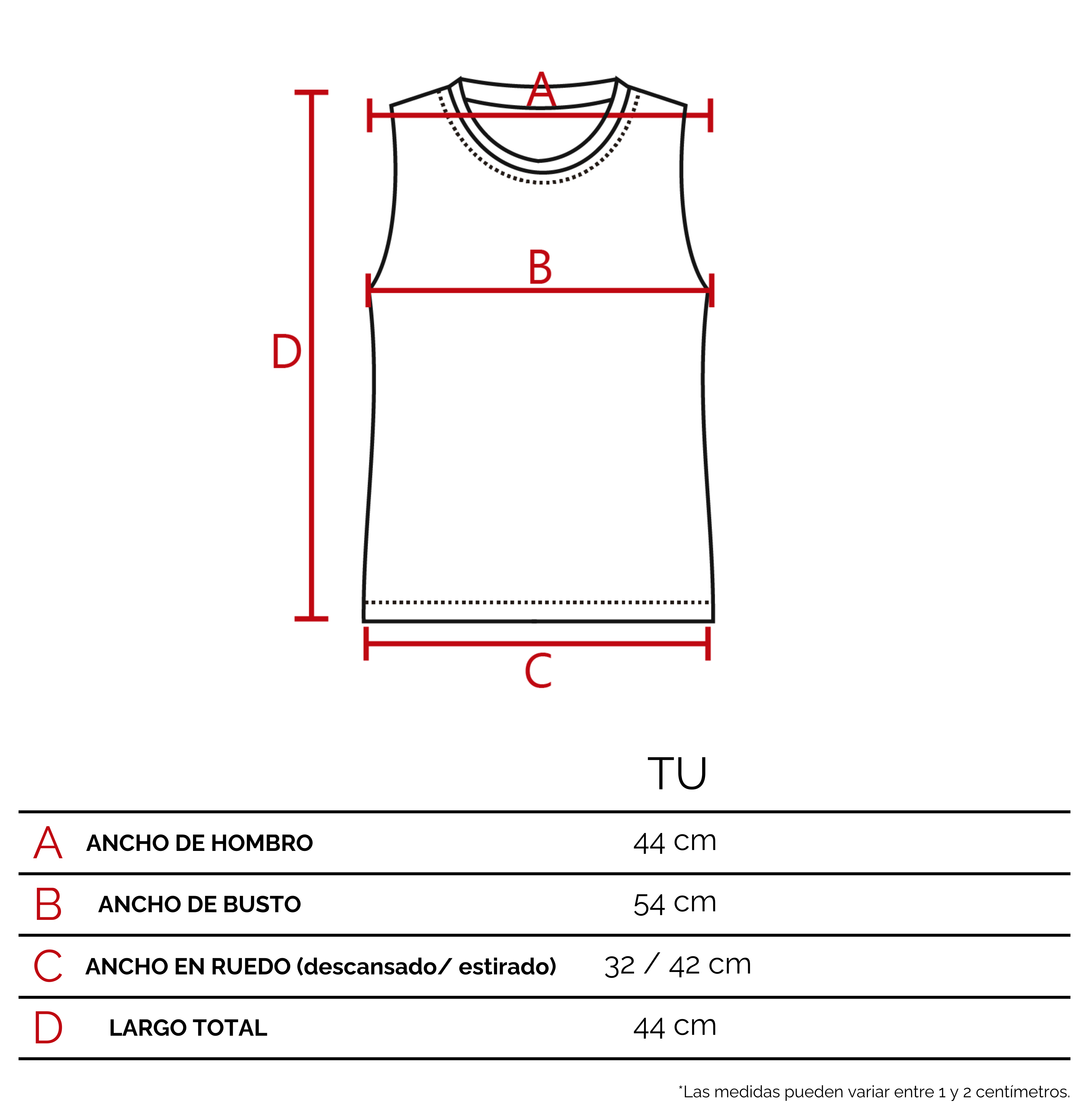 Te recomendamos que agarres una prenda tuya, de características similares a éste producto. Extendela sobre una superficie plana, y con un centímetro tomá las medidas sobre los puntos como lo indicamos en el dibujo. De esta manera vas a poder tener una referencia del tamaño de la prenda.