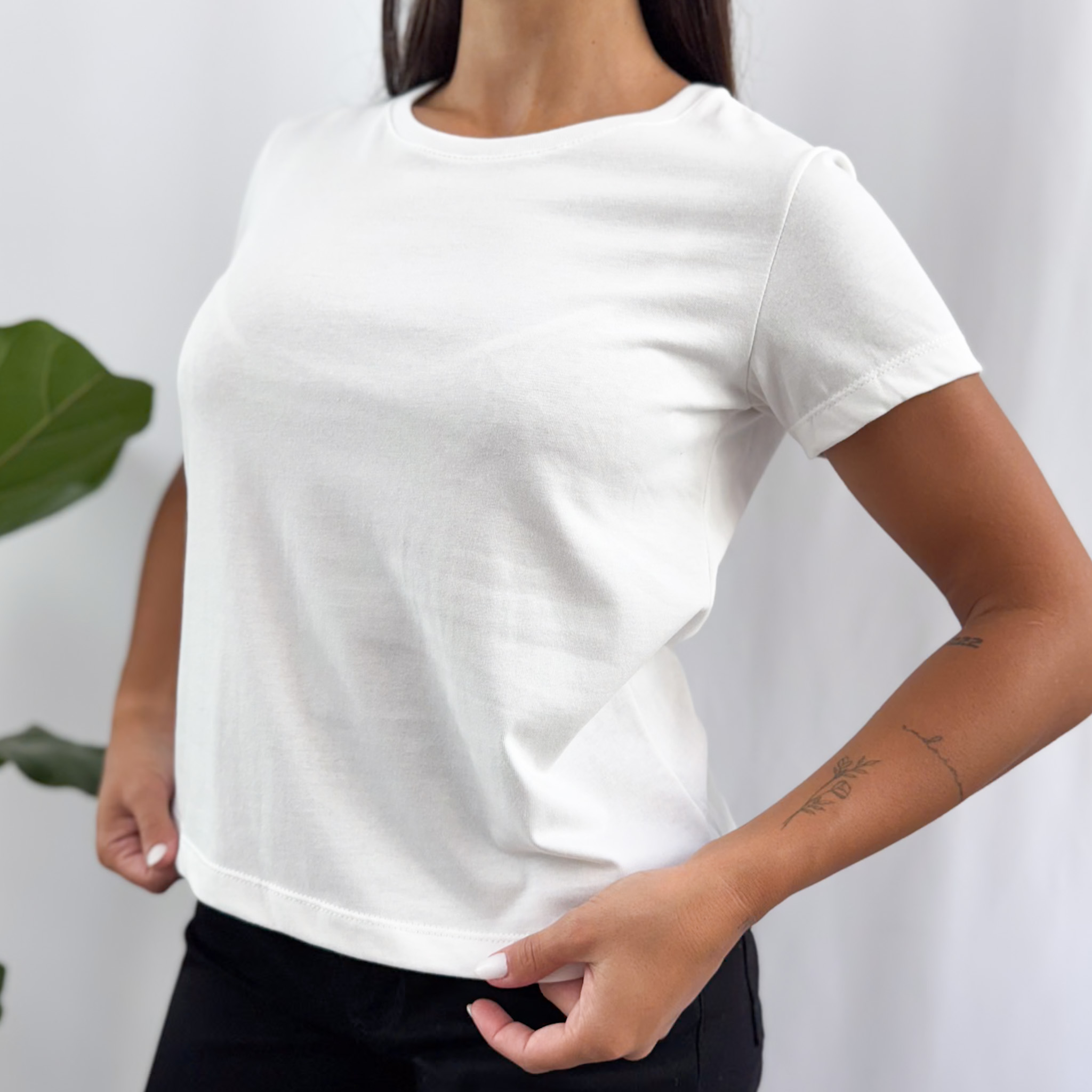 La REMERA RIA NEW es una reversión de nuestra remera Ria, uno de los modelos más vendidos cada año! Es de escote redondo cerrado a la base, con mangas cortas y tiene apenas una forma evasé, que ayuda a que se marque sutilmente la silueta. Está hecha en un jersey de algodón de excelente calidad, súper suave y agradable al contacto con la piel. Es esa básica que no puede faltar en nuestro armario, súper versátil y atemporal para usar en cualquier ocasión.