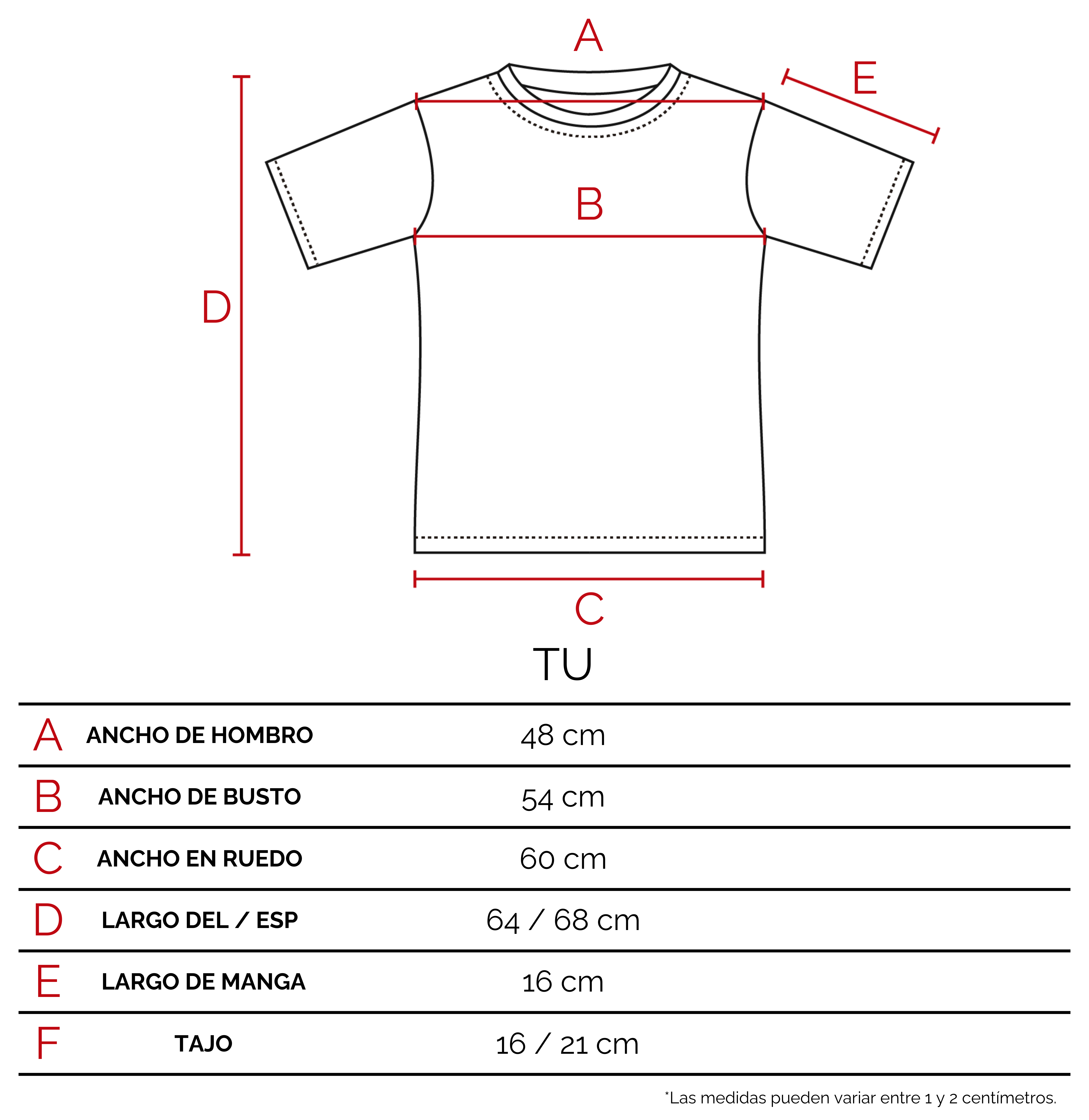 Te recomendamos que agarres una prenda tuya, de características similares a éste producto. Extendela sobre una superficie plana, y con un centímetro tomá las medidas sobre los puntos como lo indicamos en el dibujo. De esta manera vas a poder tener una referencia del tamaño de la prenda.