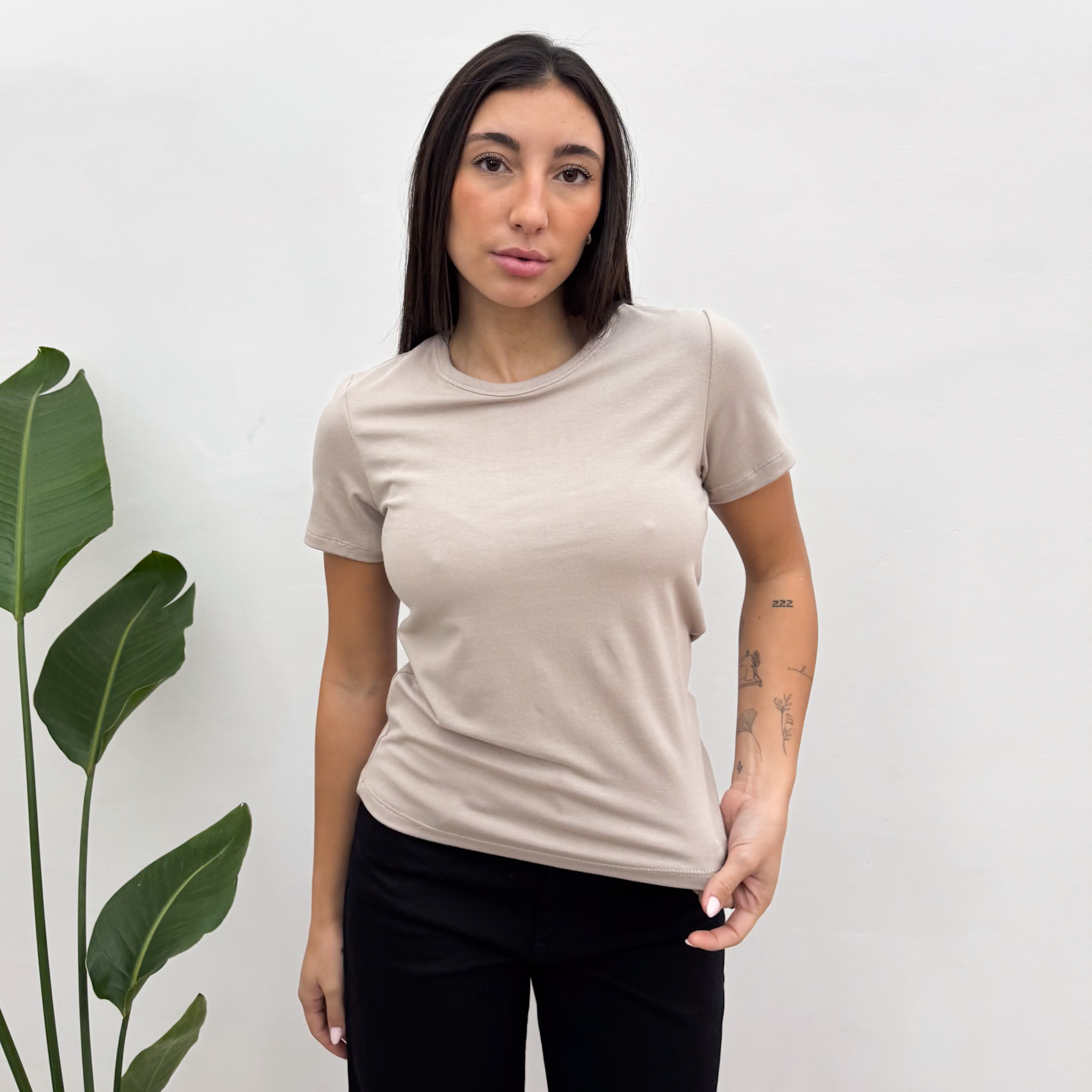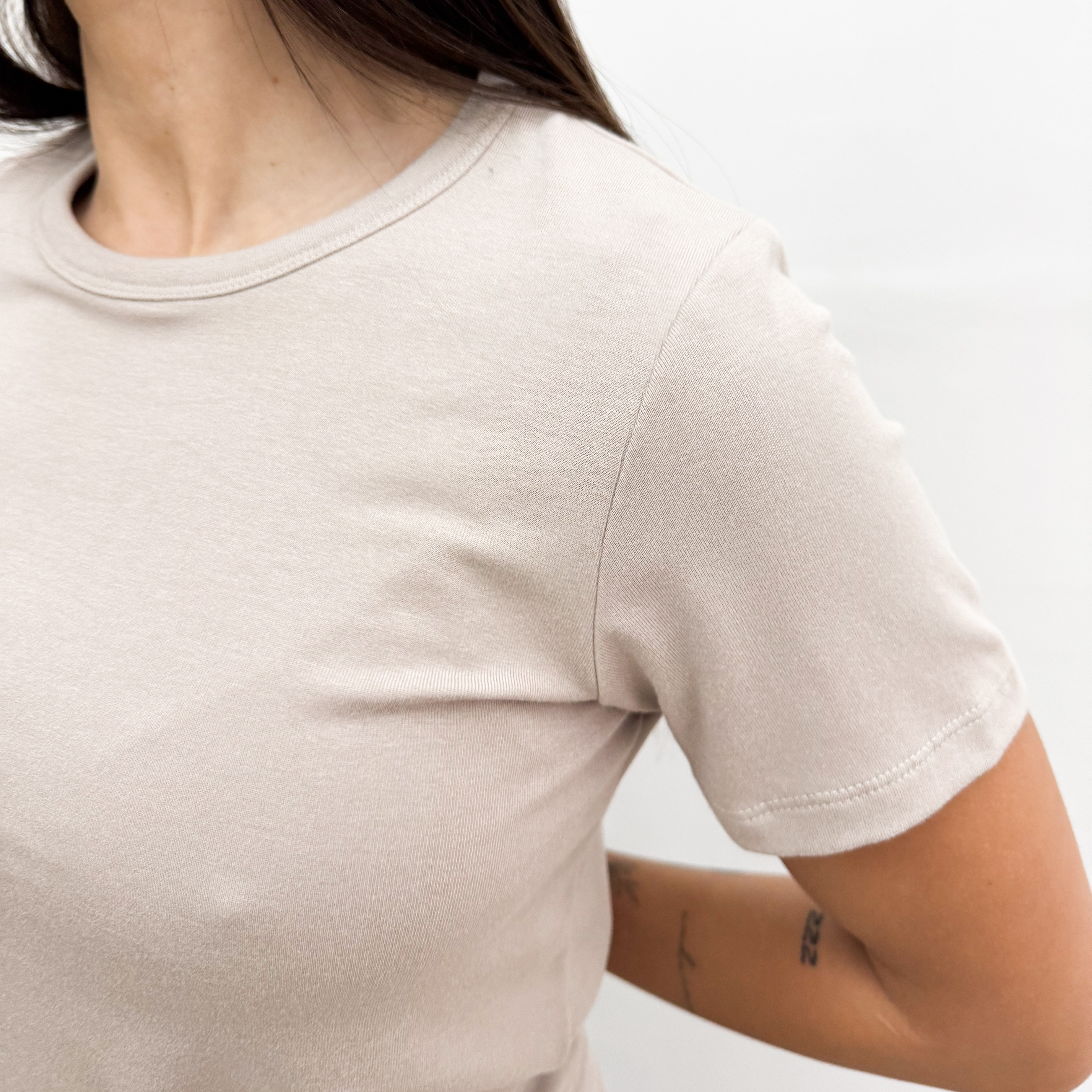 La REMERA TEODORA es una remera básica hecha en ribb de viscosa, de manga corta y cuello redondo. Tiene el cuello envivado y su largo es a la primera cadera. Es esa remera que no puede faltar en una base de armario y que vas a usar todo el año!