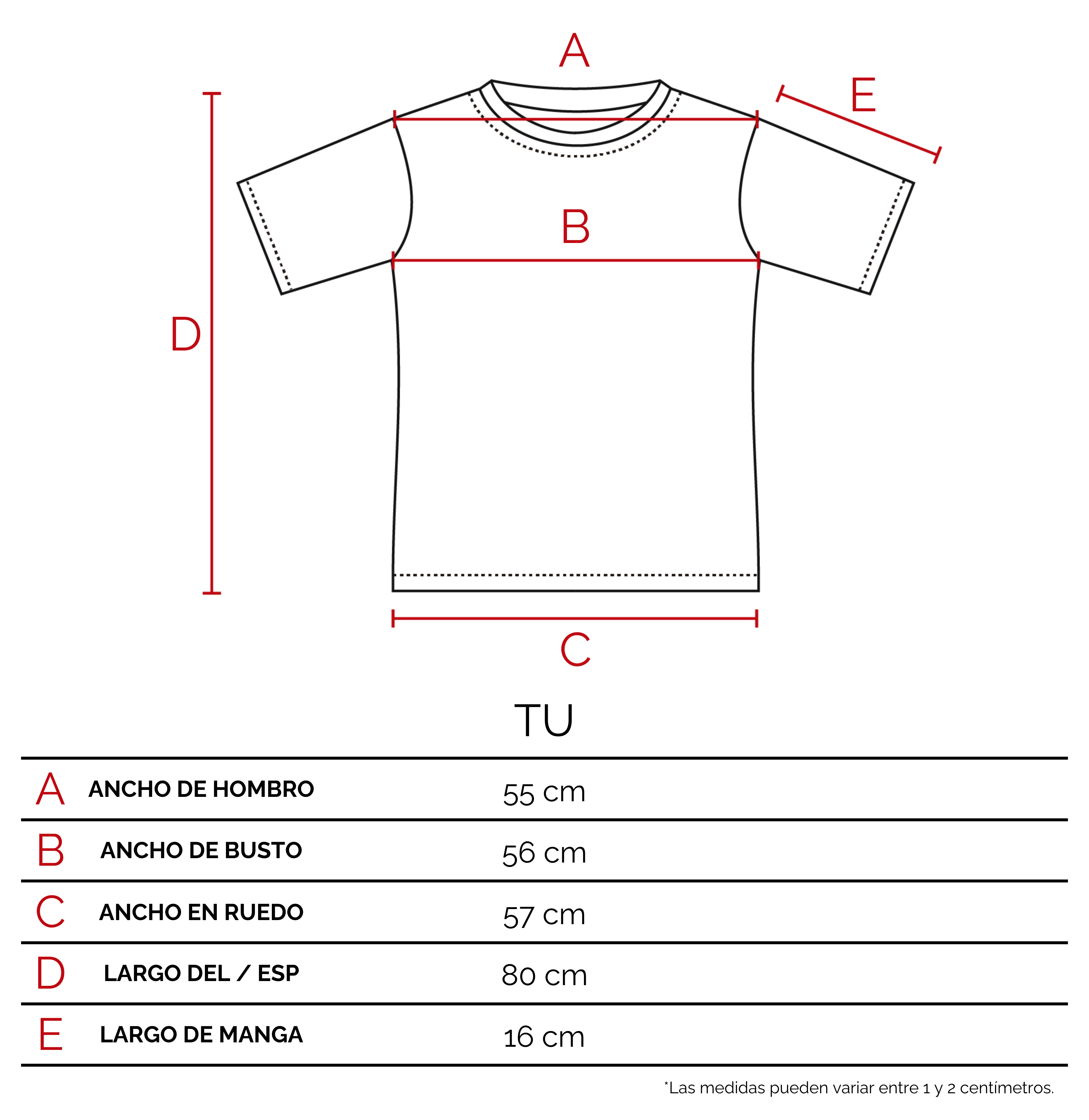 Te recomendamos que agarres una prenda tuya, de características similares a éste producto. Extendela sobre una superficie plana, y con un centímetro tomá las medidas sobre los puntos como lo indicamos en el dibujo. De esta manera vas a poder tener una referencia del tamaño de la prenda.