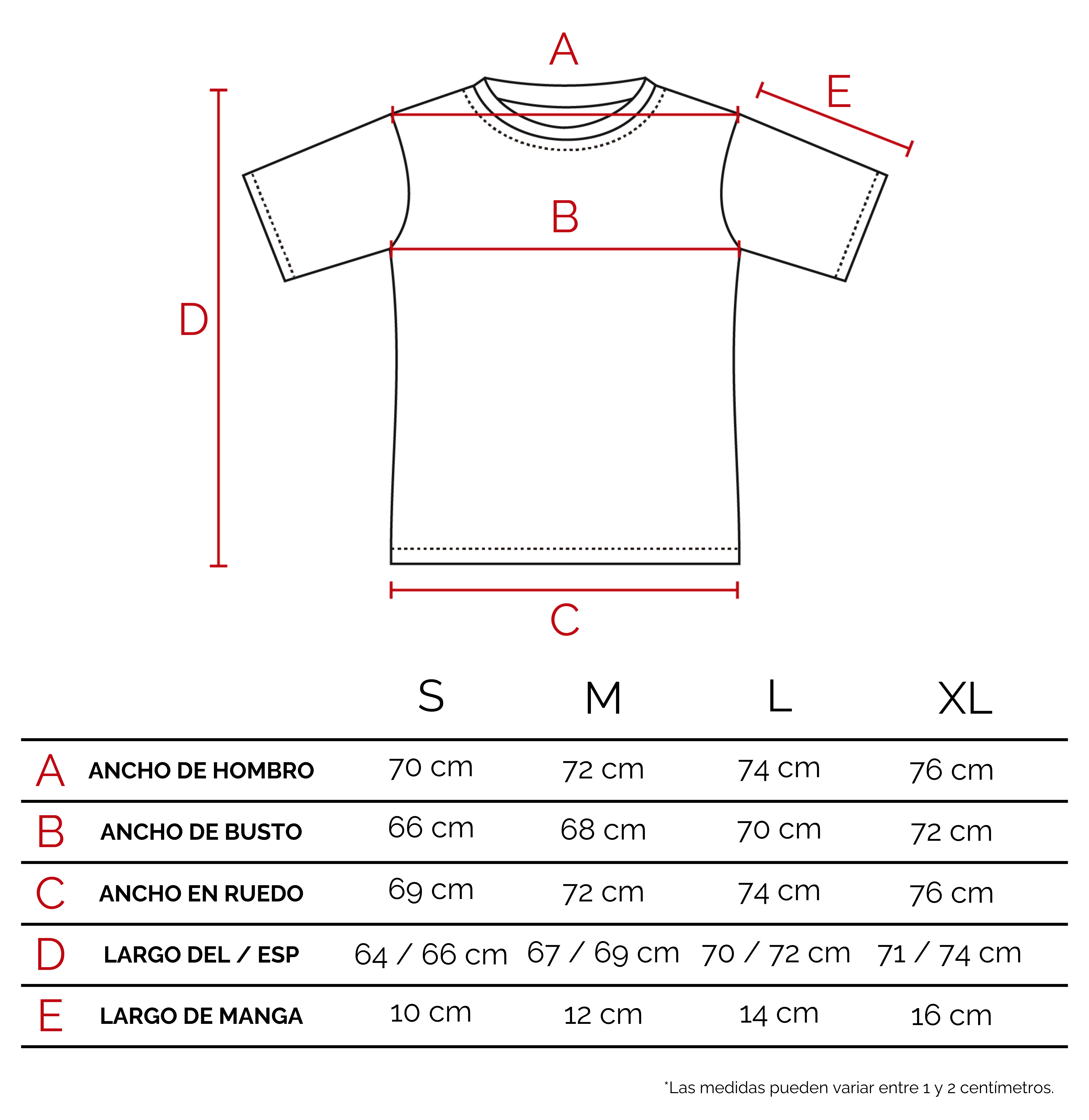 Te recomendamos que agarres una prenda tuya, de características similares a éste producto. Extendela sobre una superficie plana, y con un centímetro tomá las medidas sobre los puntos como lo indicamos en el dibujo. De esta manera vas a poder tener una referencia del tamaño de la prenda.