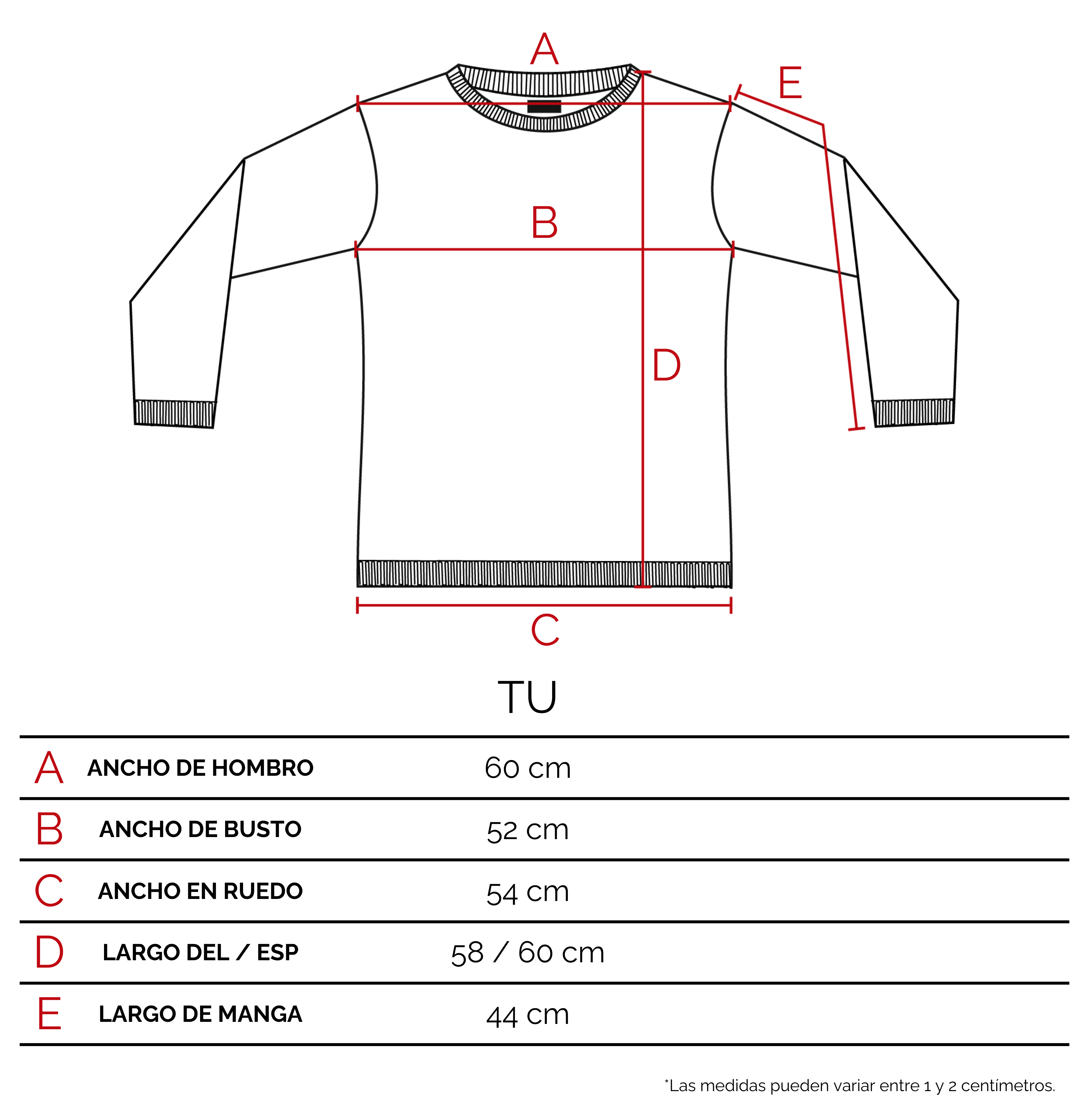 Te recomendamos que agarres una prenda tuya, de características similares a éste producto. Extendela sobre una superficie plana, y con un centímetro tomá las medidas sobre los puntos como lo indicamos en el dibujo. De esta manera vas a poder tener una referencia del tamaño de la prenda.