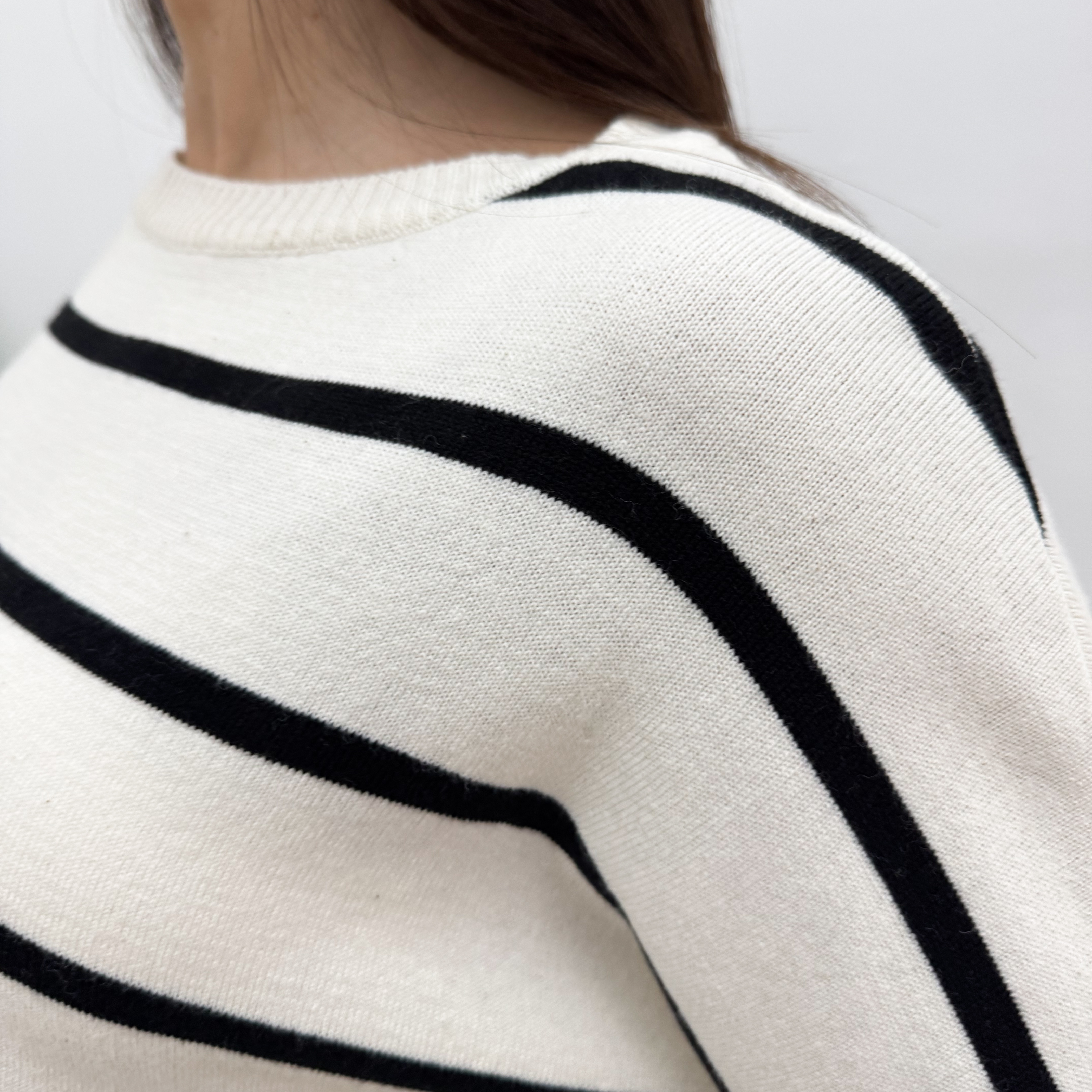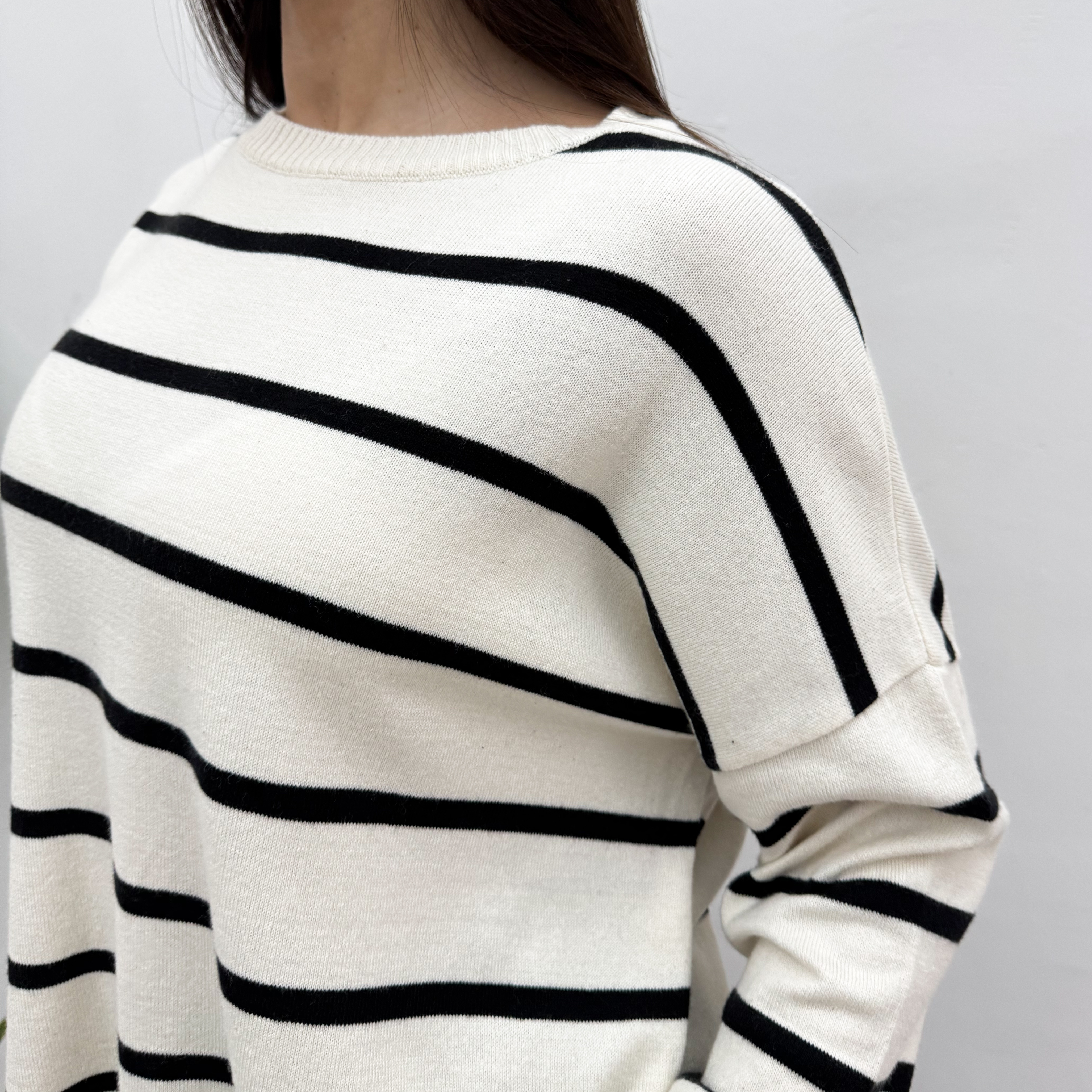 El SWEATER GULIA es un sweater básico a rayas amplio, con hombro caído, y es una pieza clave de un fondo de armario. Es ese sweater versátil que se adapta a muchos estilos y le agrega un toque muy moderno a cualquier look!