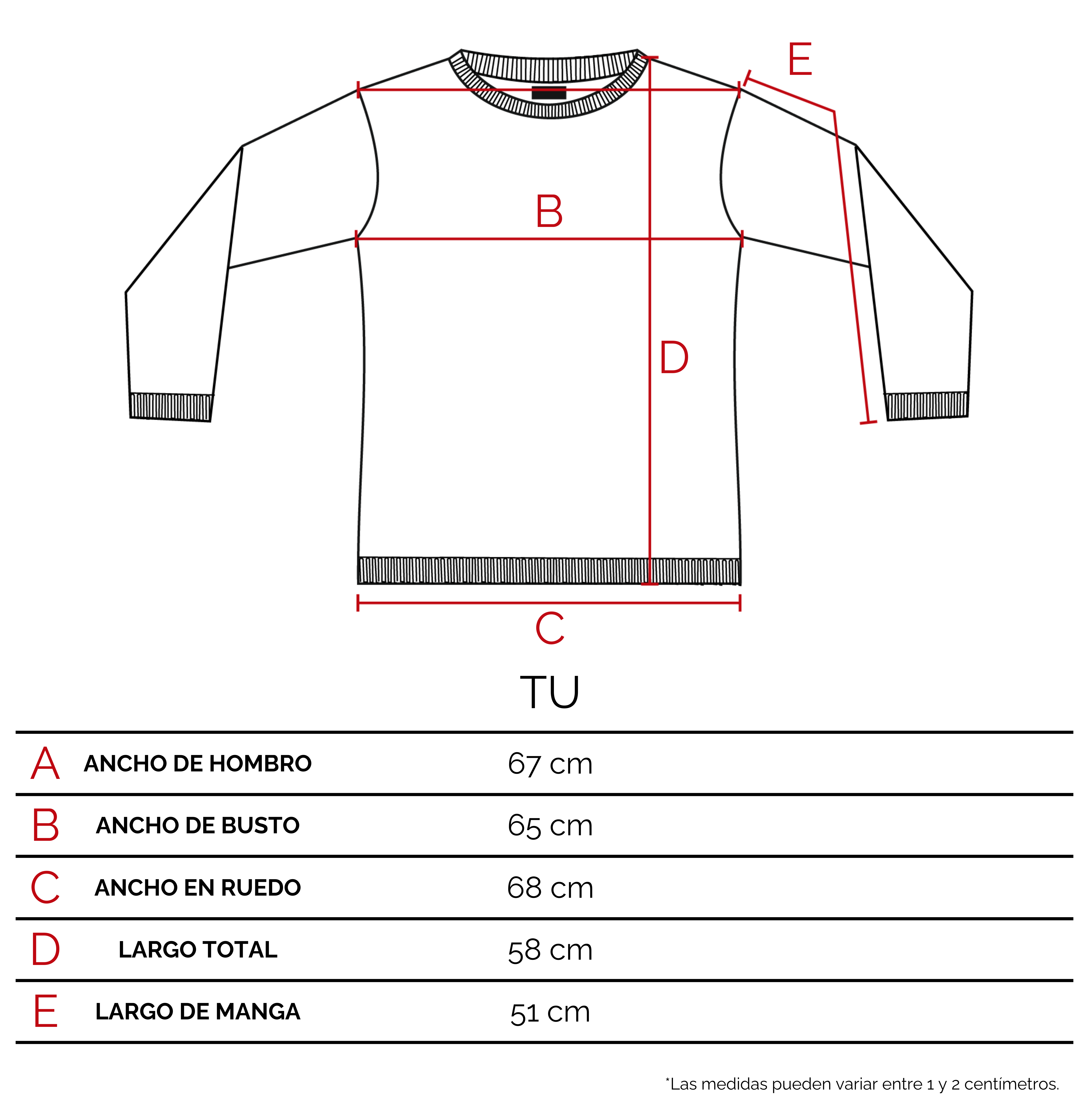 Te recomendamos que agarres una prenda tuya, de características similares a éste producto. Extendela sobre una superficie plana, y con un centímetro tomá las medidas sobre los puntos como lo indicamos en el dibujo. De esta manera vas a poder tener una referencia del tamaño de la prenda.