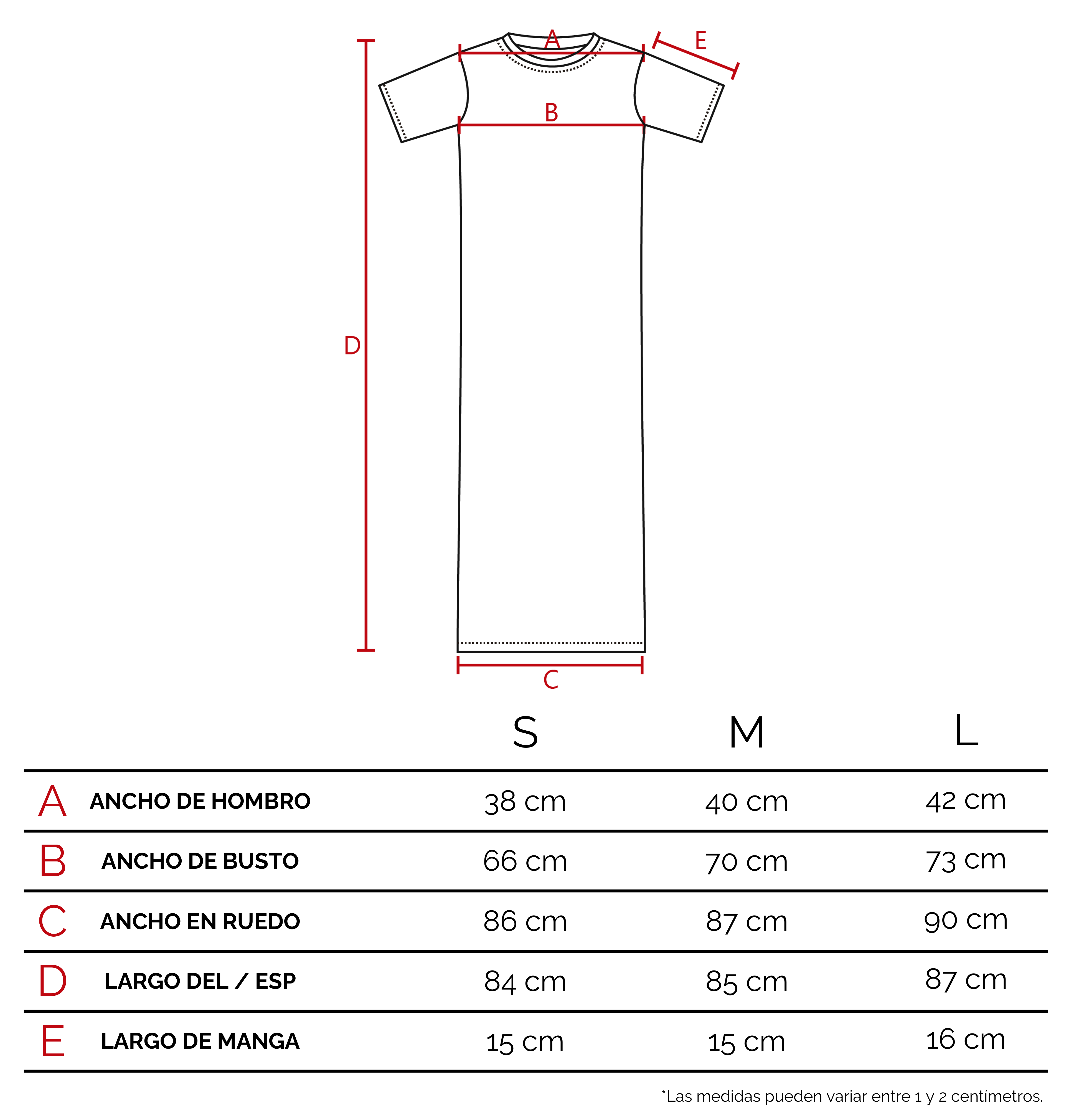 Te recomendamos que agarres una prenda tuya, de características similares a éste producto. Extendela sobre una superficie plana, y con un centímetro tomá las medidas sobre los puntos como lo indicamos en el dibujo. De esta manera vas a poder tener una referencia del tamaño de la prenda.
