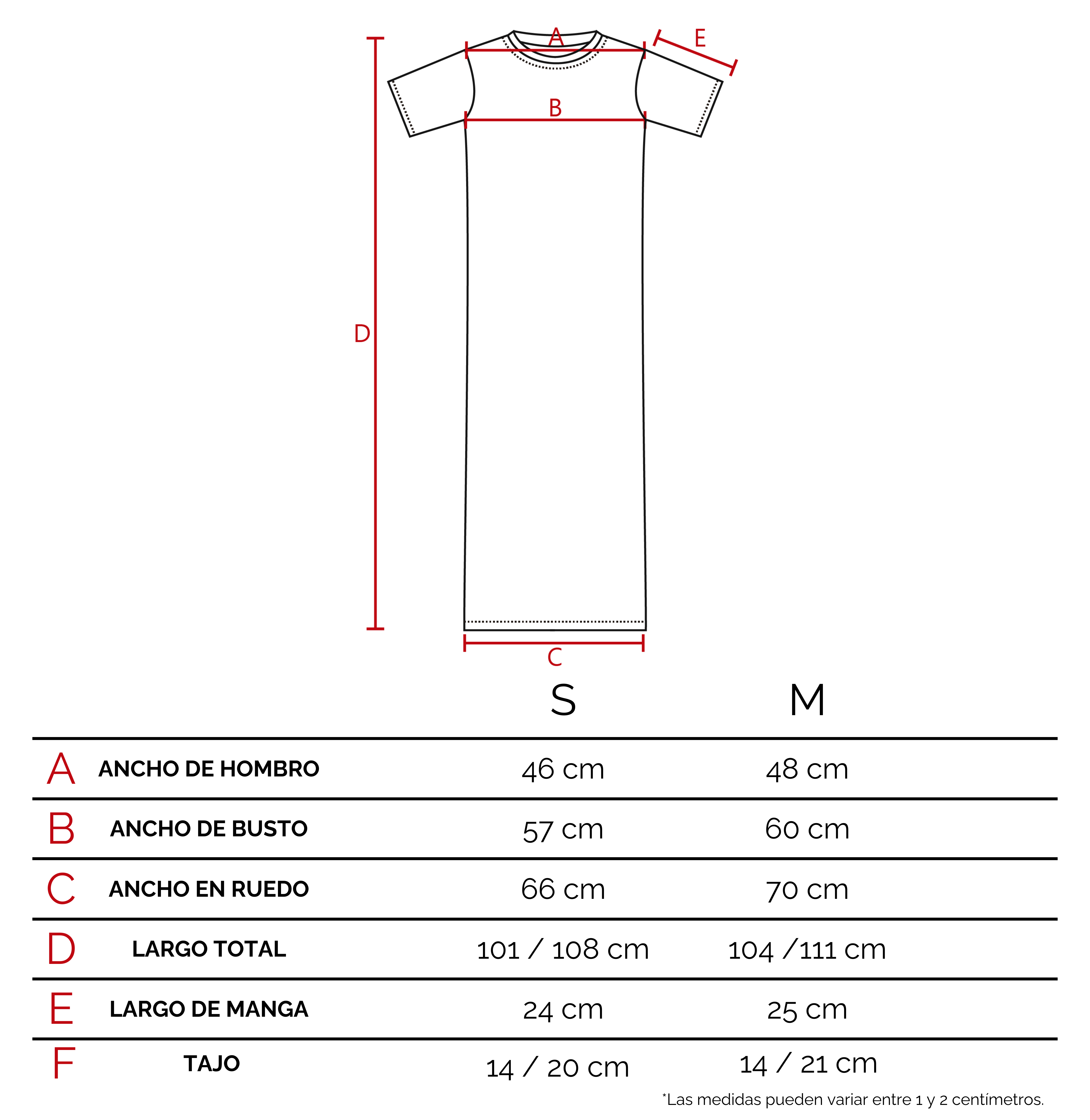 Te recomendamos que agarres una prenda tuya, de características similares a éste producto. Extendela sobre una superficie plana, y con un centímetro tomá las medidas sobre los puntos como lo indicamos en el dibujo. De esta manera vas a poder tener una referencia del tamaño de la prenda.