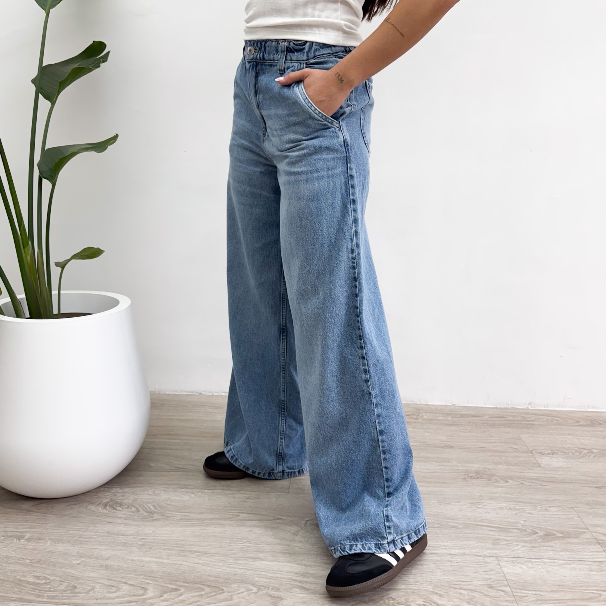 El WIDE LEG RAFAEL es un pantalón de pierna ancha súper canchero! Tiene tiro alto y el detalle de la cintura elástica en la parte trasera que le da un toque distinto! Tiene cuatro bolsillos y el color es clásico, ideal para agregar al fondo de armario!