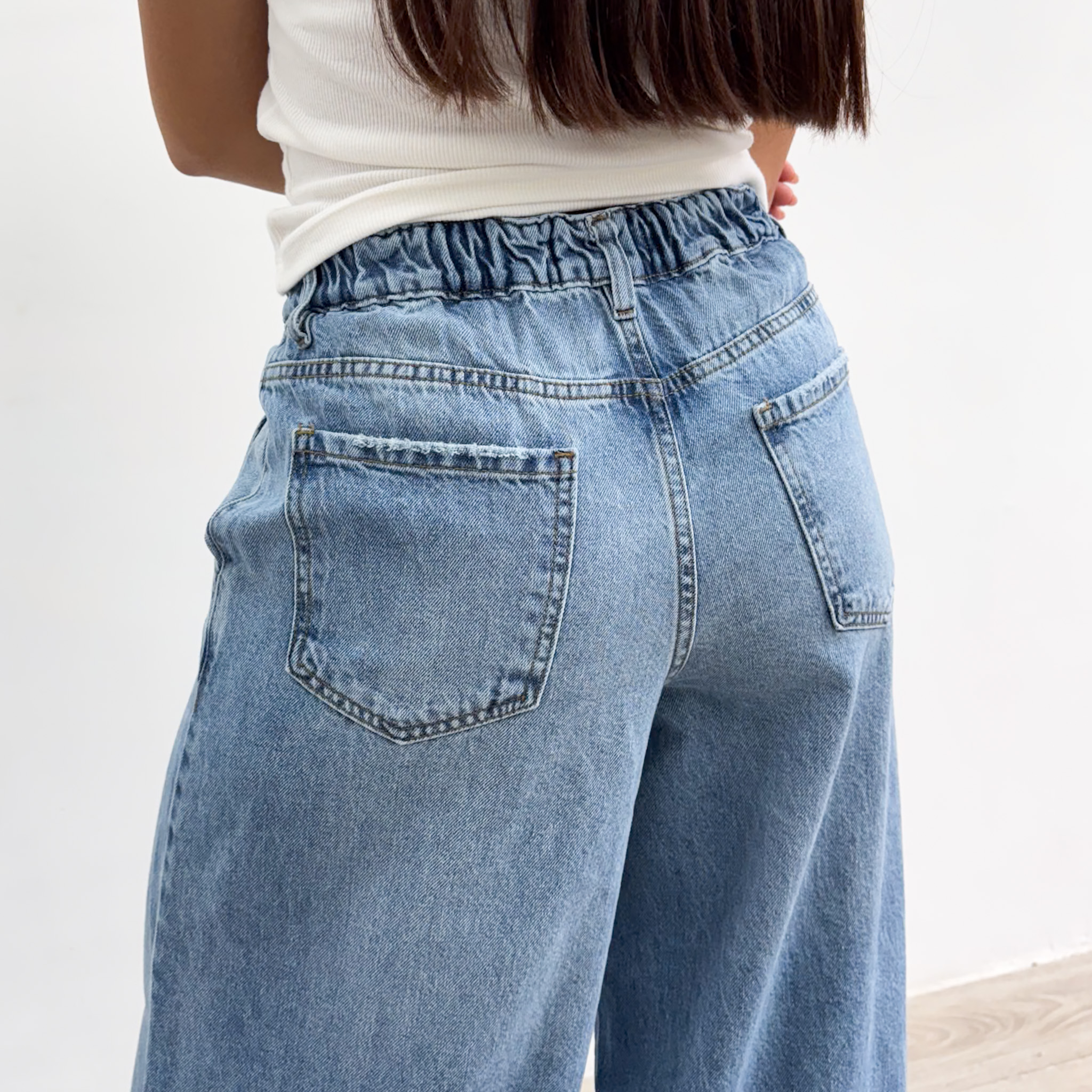 Tiene cintura elastizada en la parte trasera. Es de tiro alto y tiene 4 bolsillos.